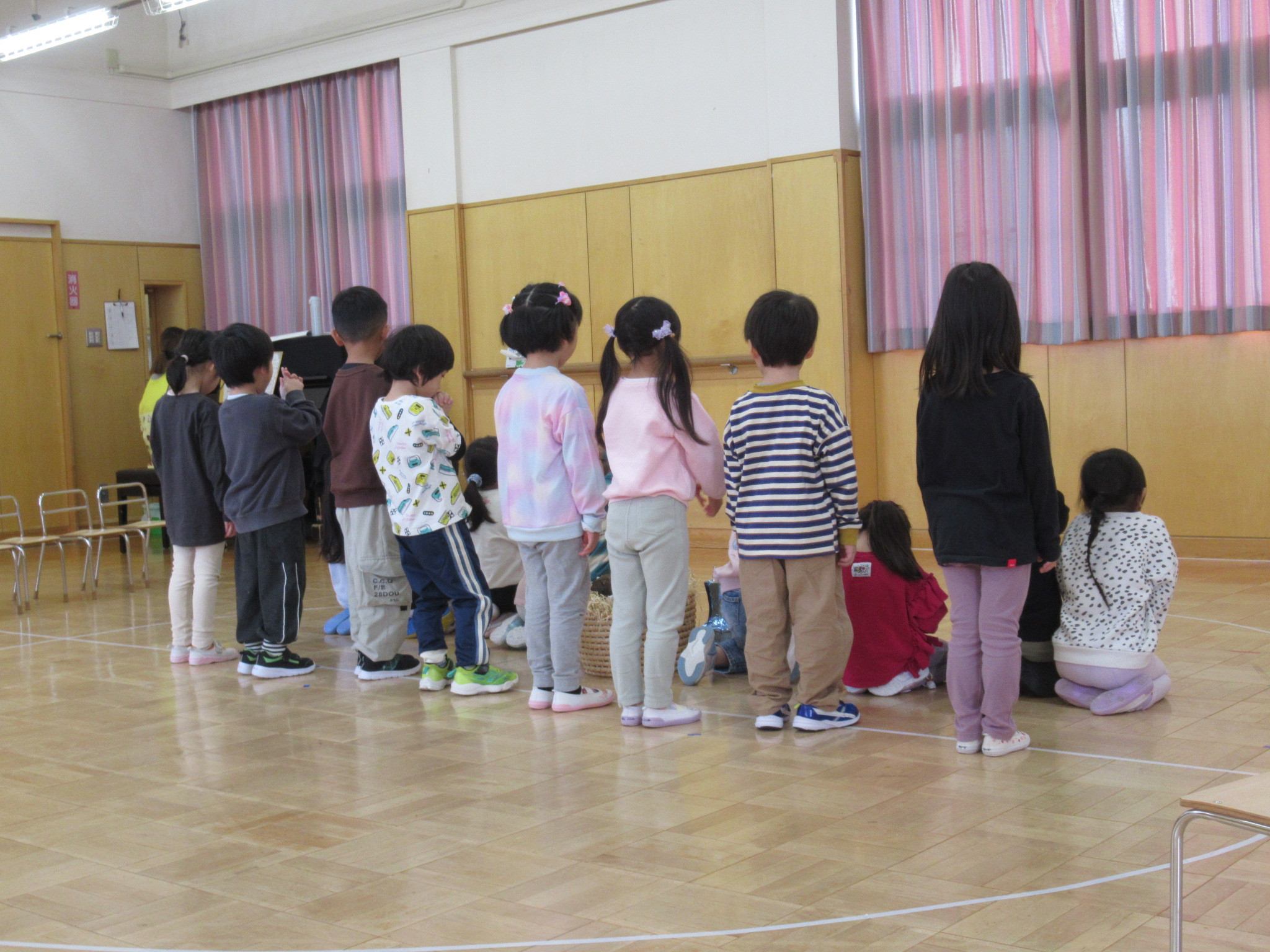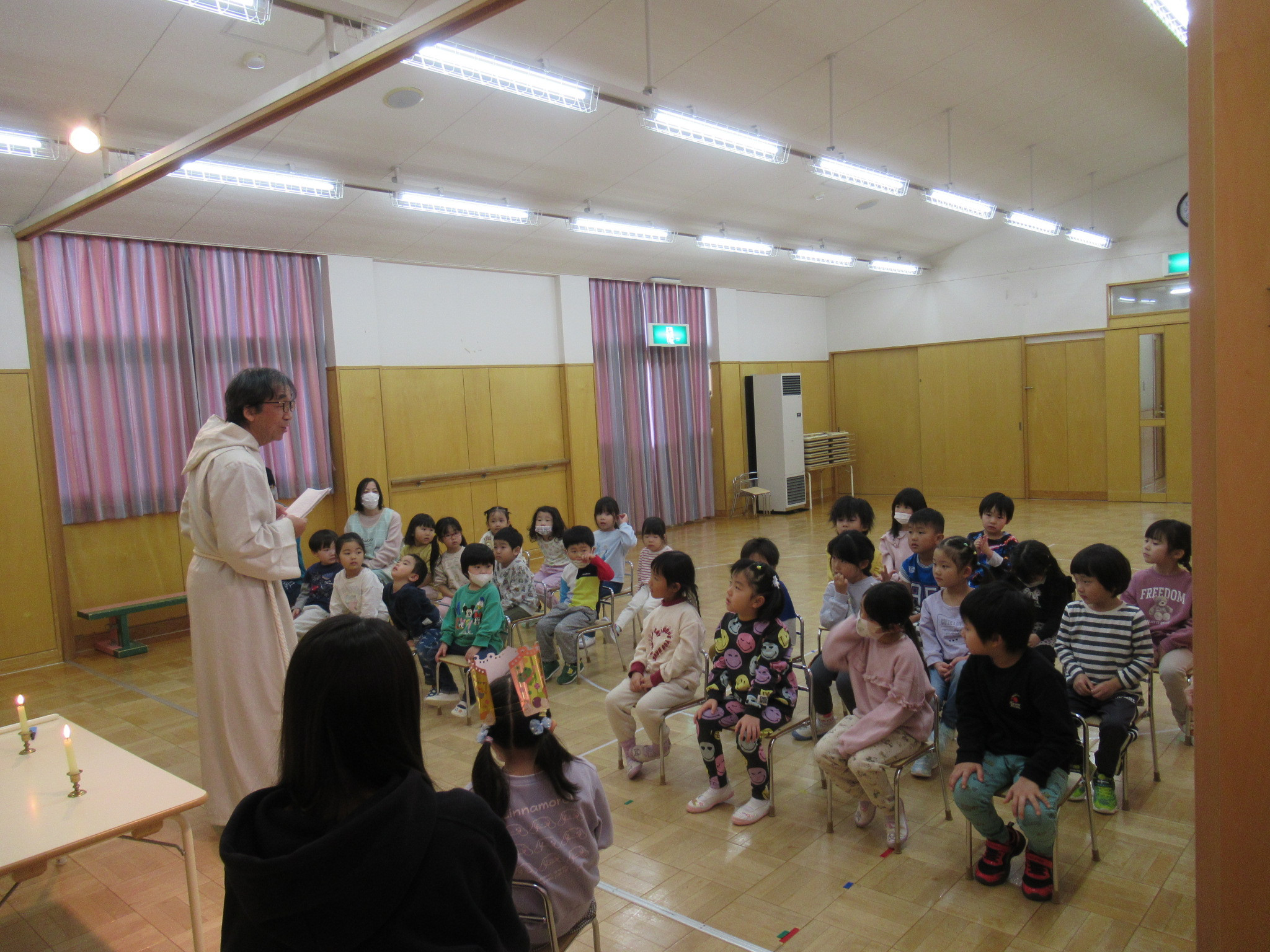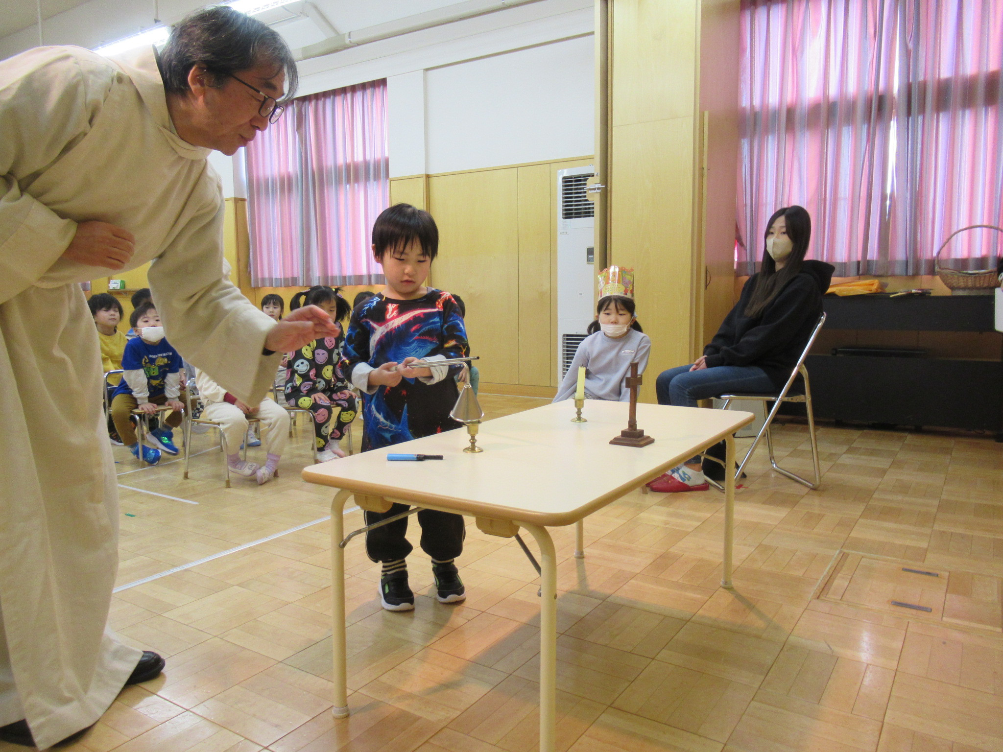 新しい聖歌の続きを歌いました。素敵なくじら組の歌を聞いて、可愛らしく歌っていましたよ。少し長めのうたなので続きはまた、明日です。