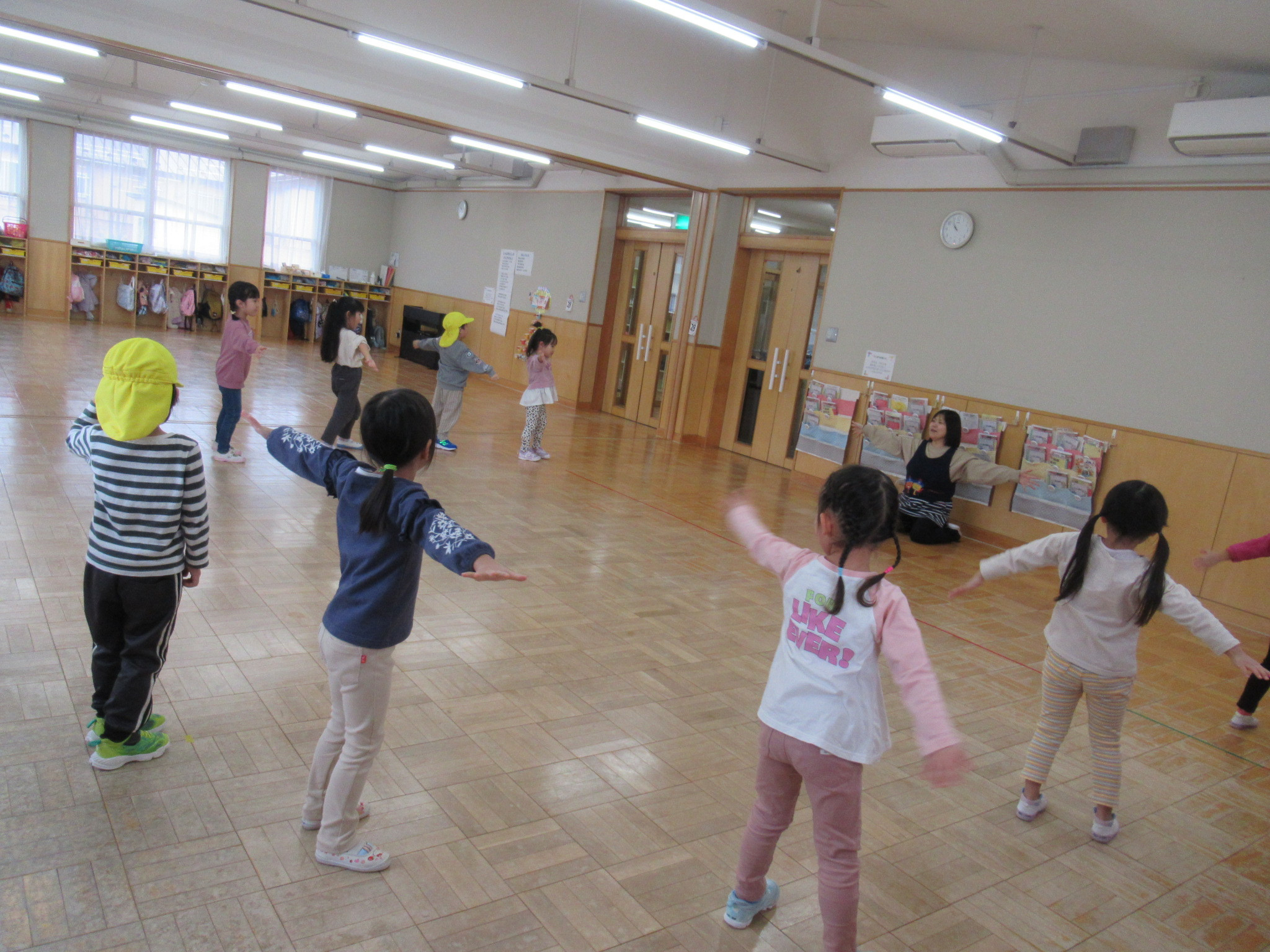 元気いっぱいに発表会の練習をしています。練習の後は線遊びやなわとびをして遊びました。