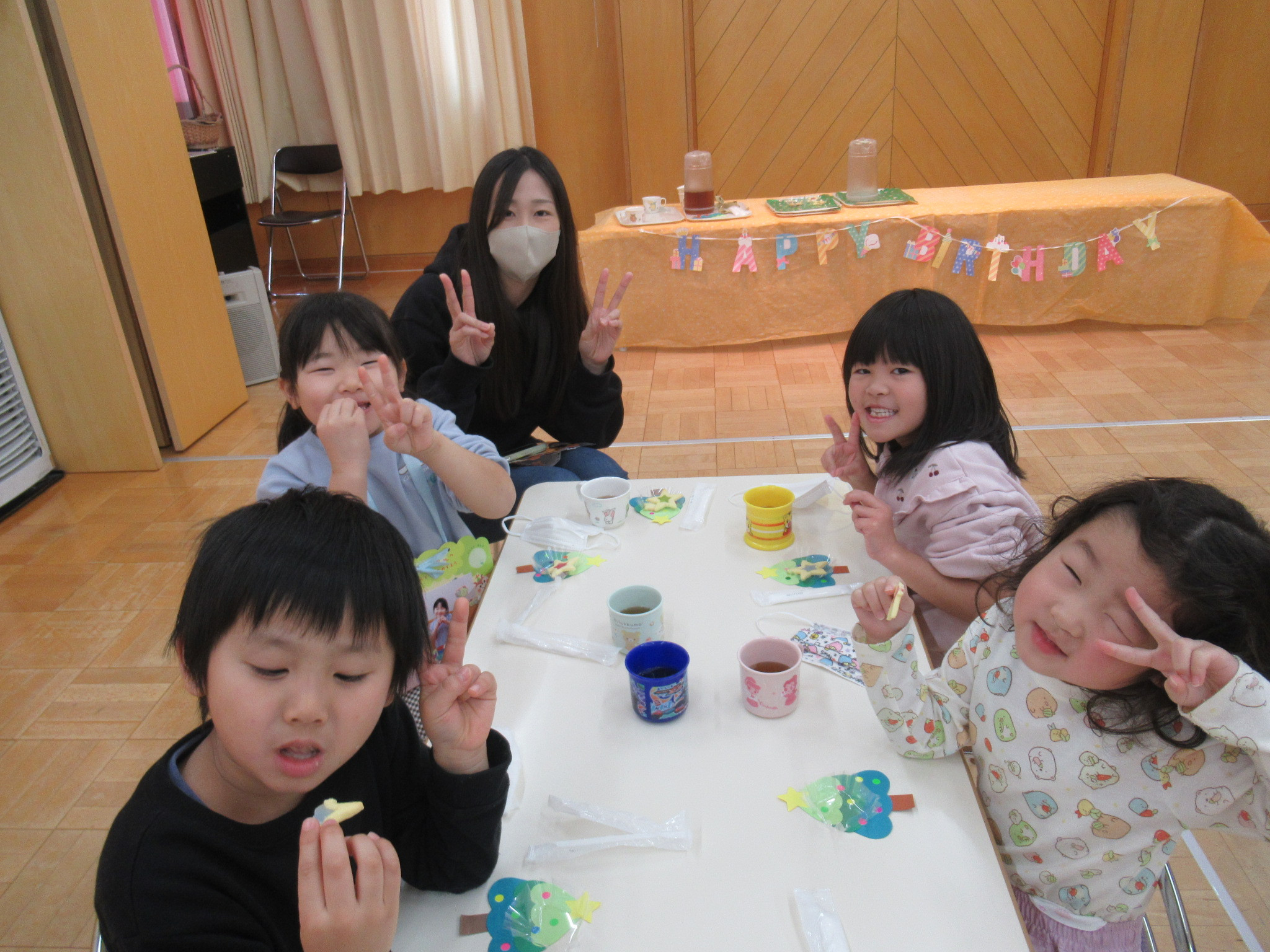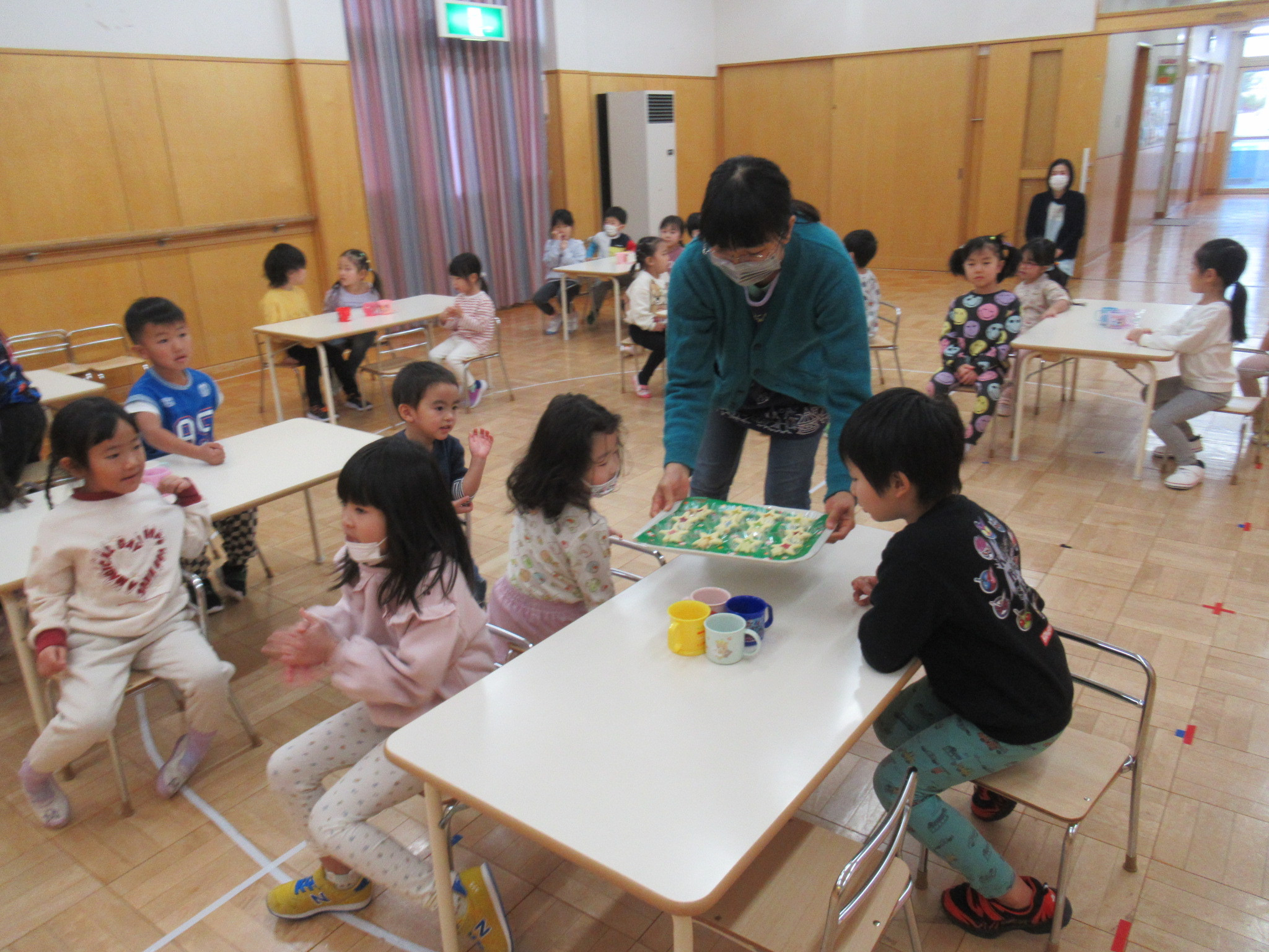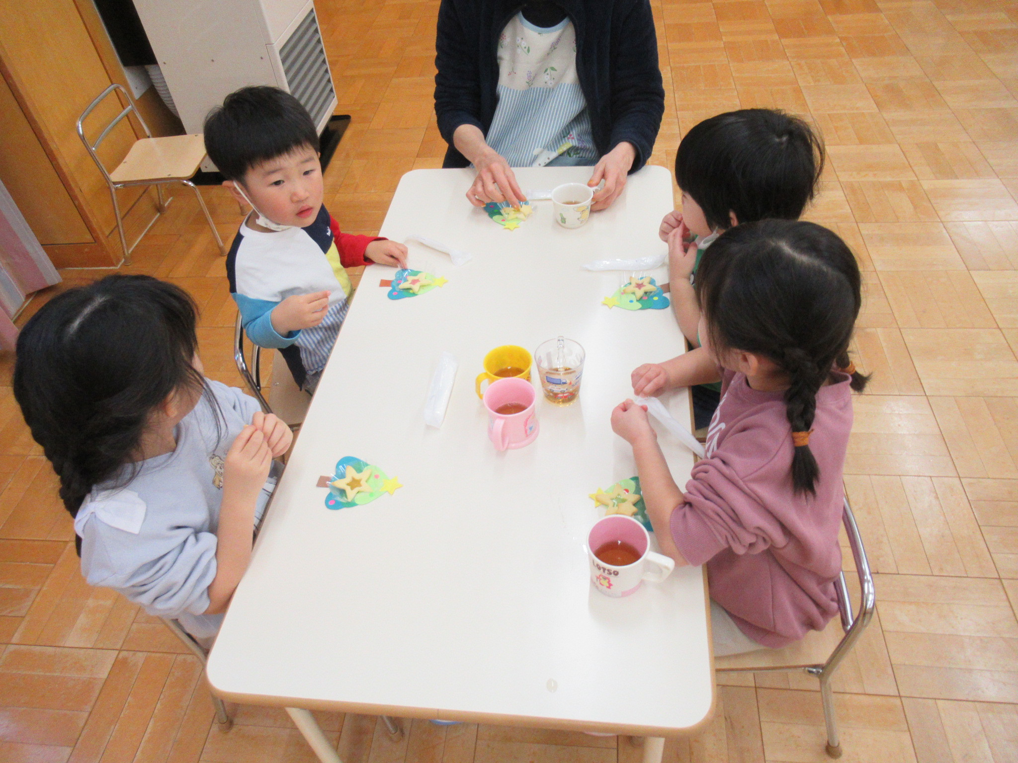 おやつは「キラキラ☆おほしさまクッキー」です。「キラキラ星が光ってるー」と楽しく食べました。