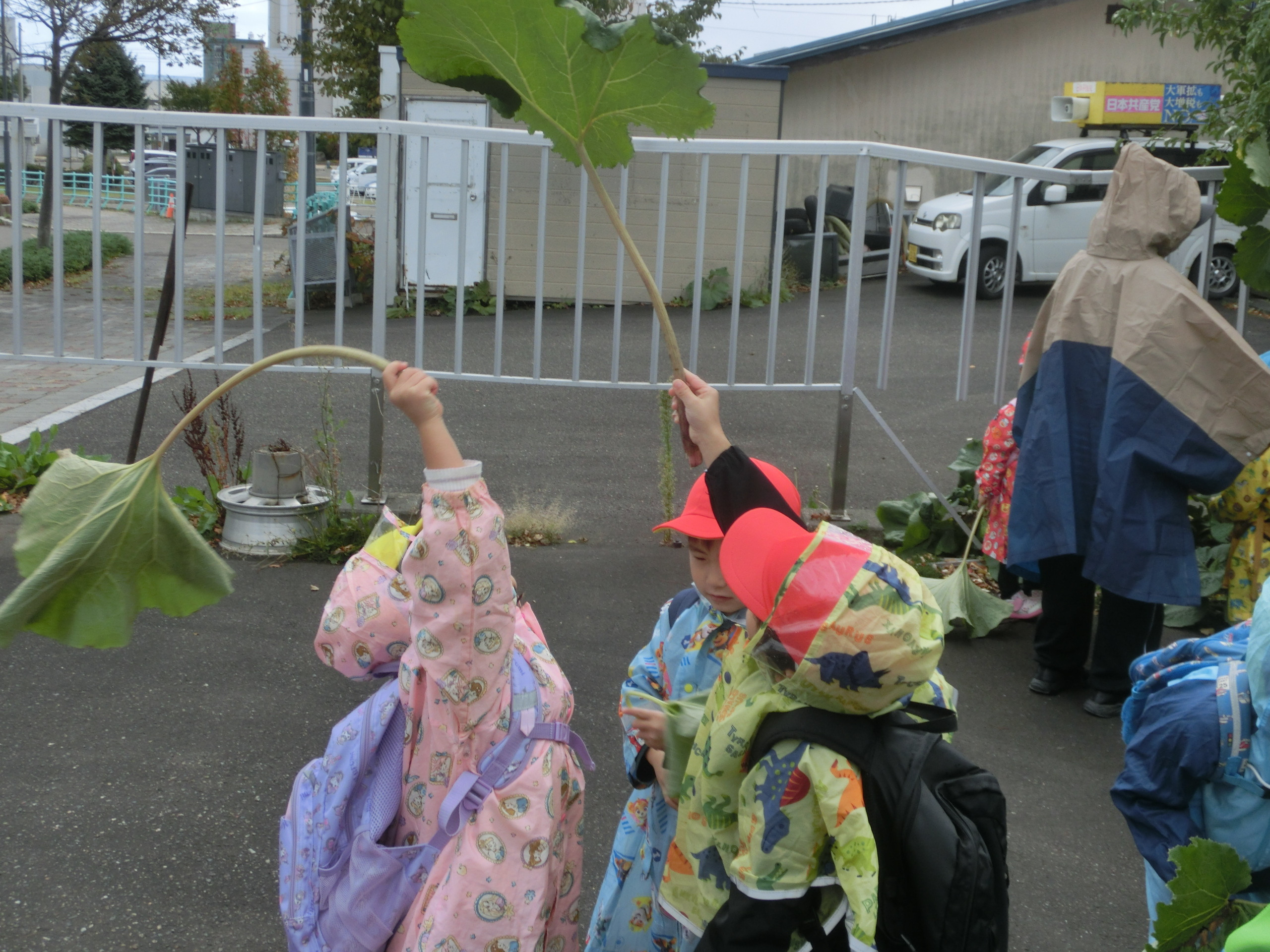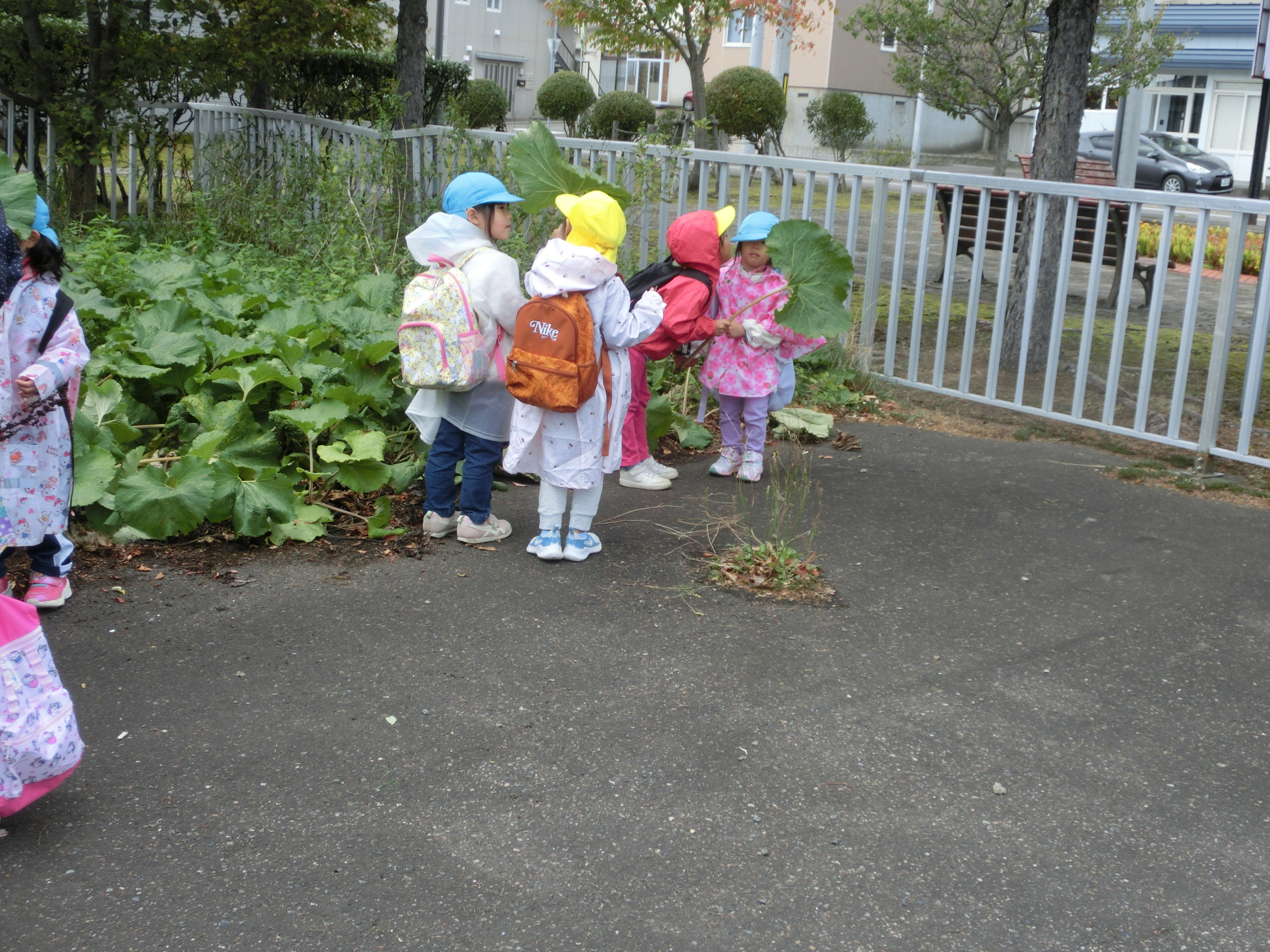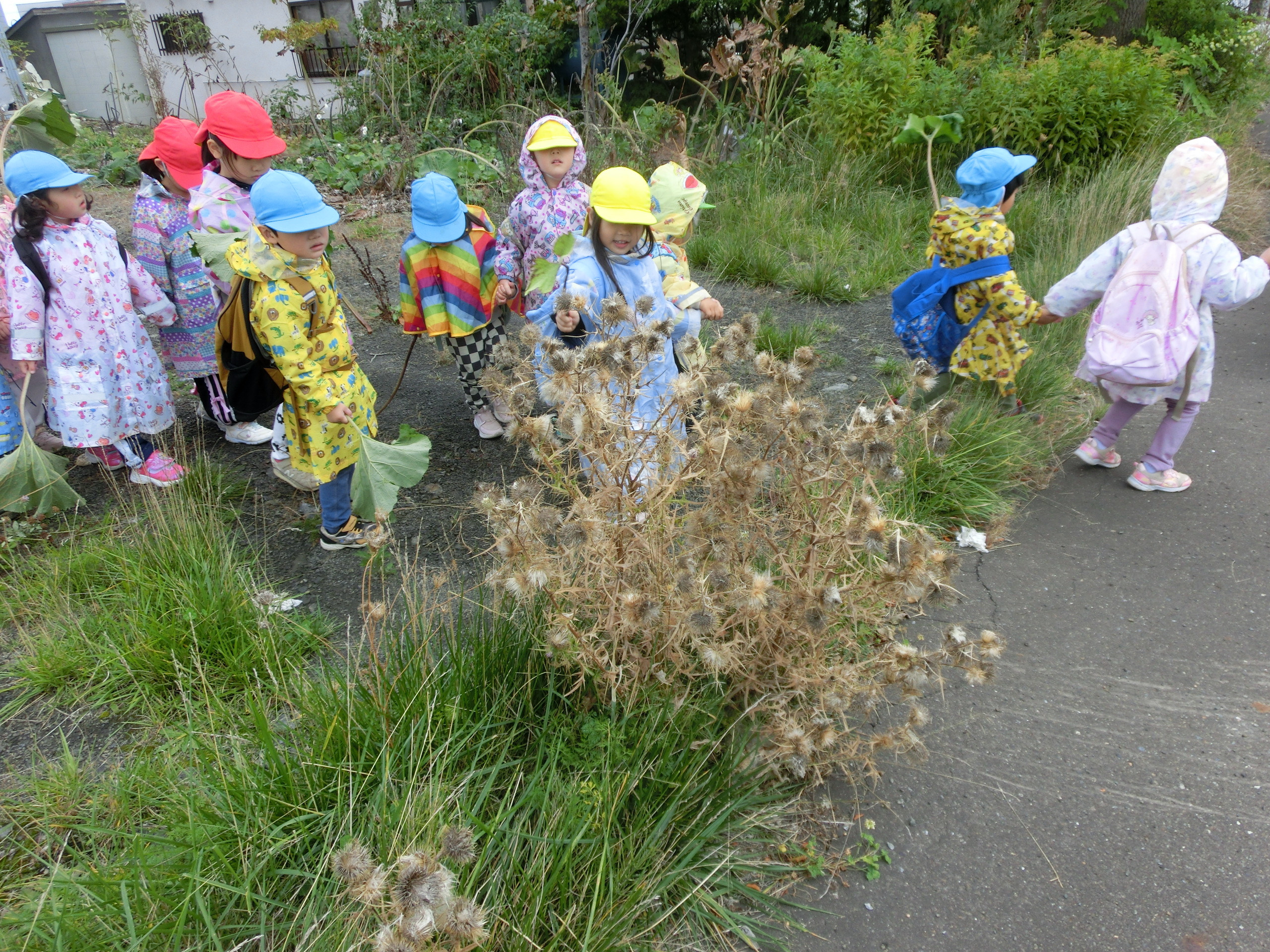 そして歩いて行くと、フキを見つけたので傘にしました。木の間をグルグルしたり、秋の草花を見ながら歩きましたよ。