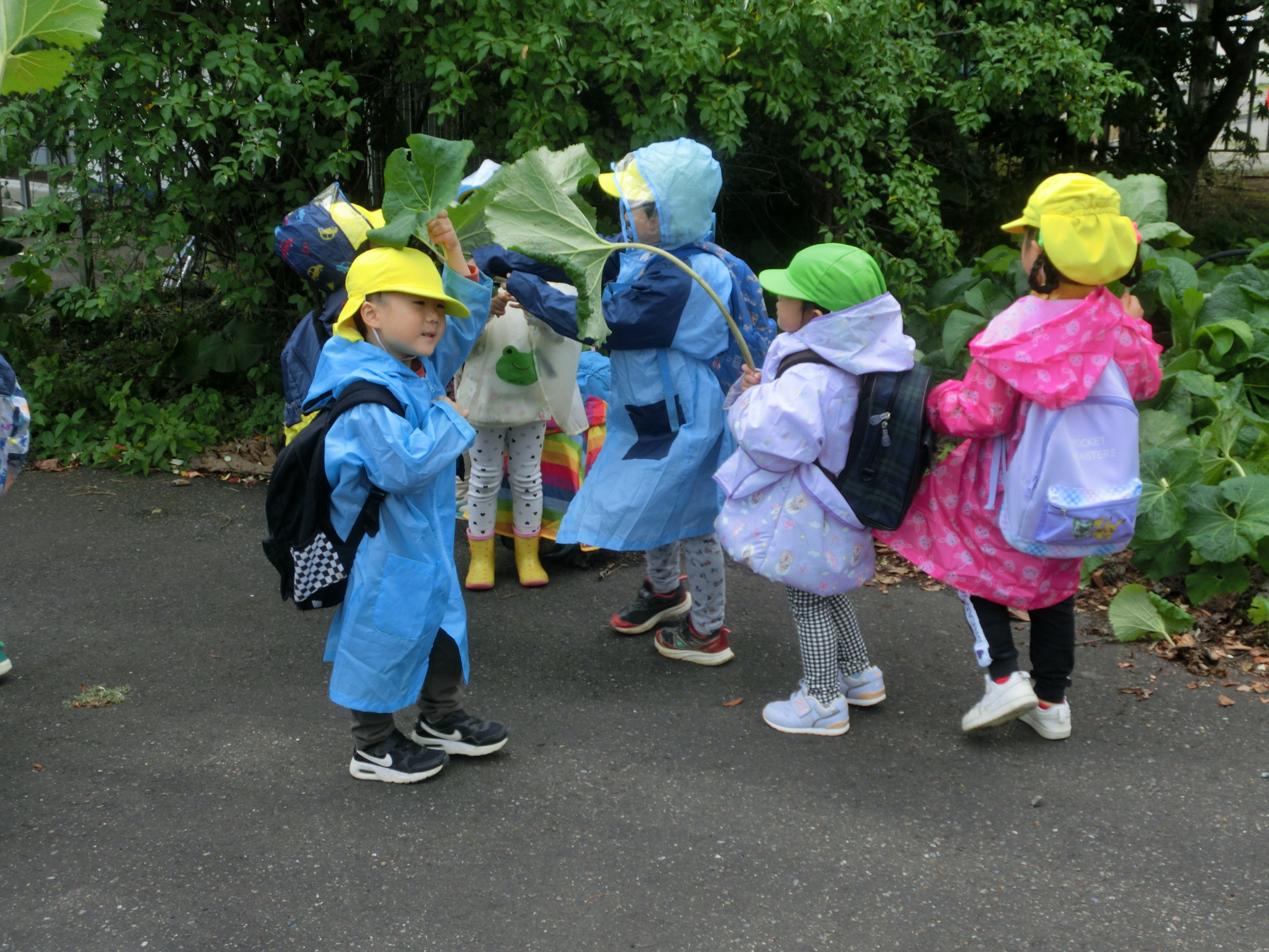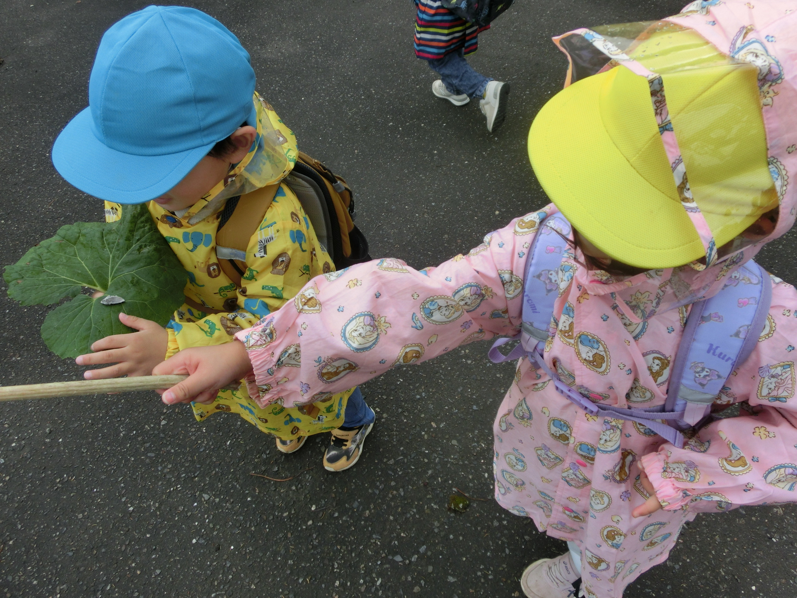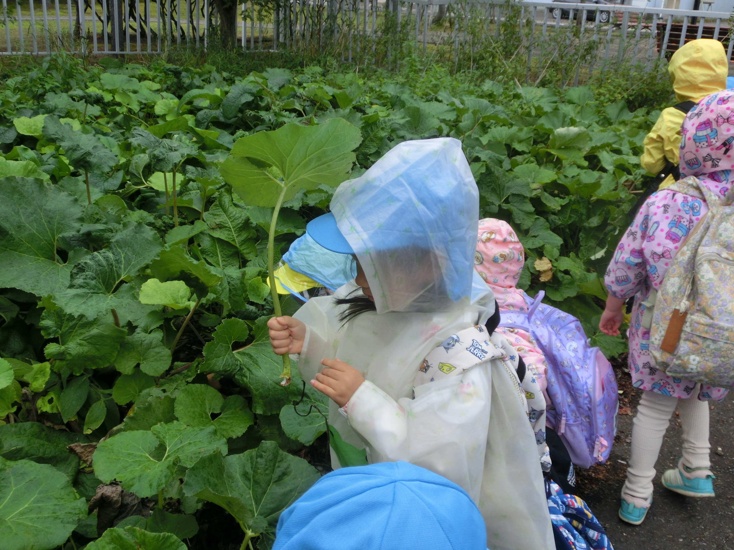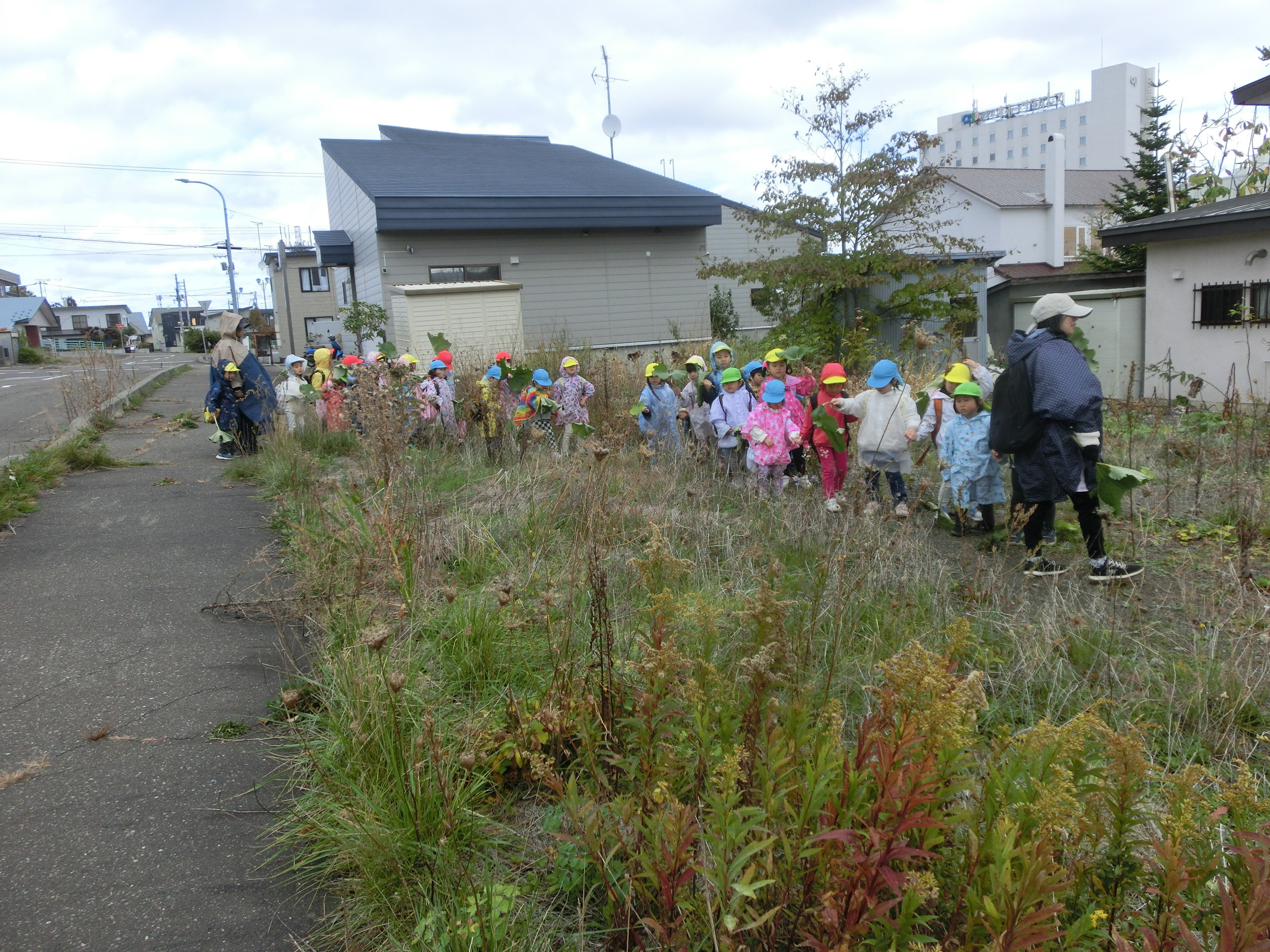 そして歩いて行くと、フキを見つけたので傘にしました。木の間をグルグルしたり、秋の草花を見ながら歩きましたよ。