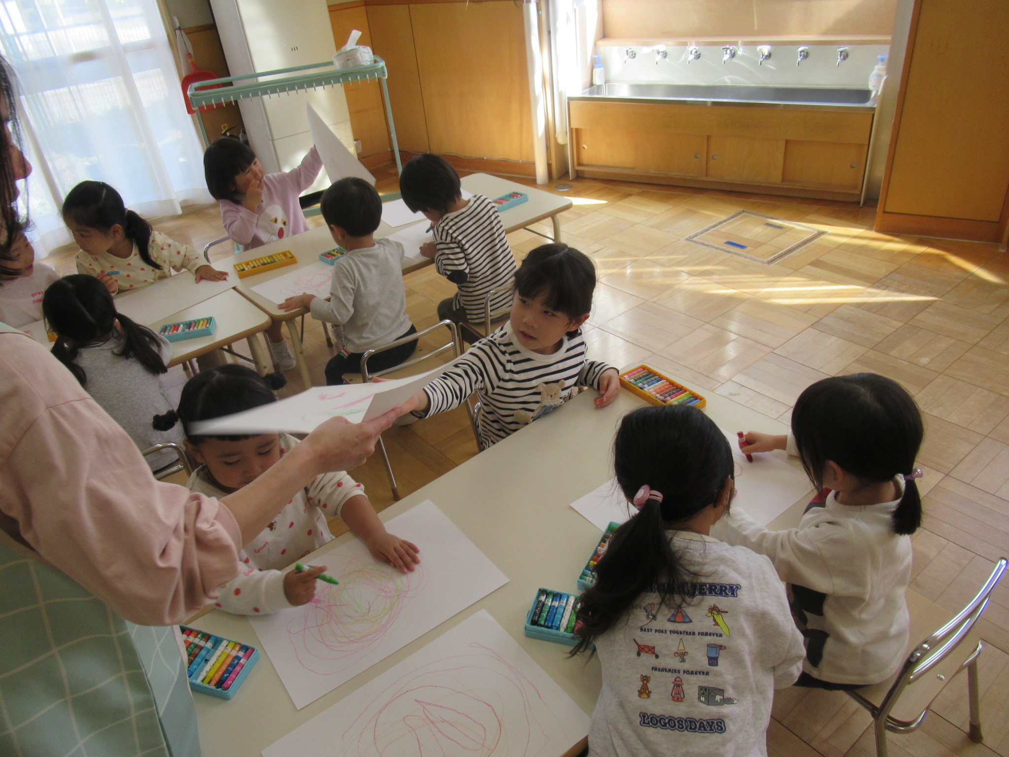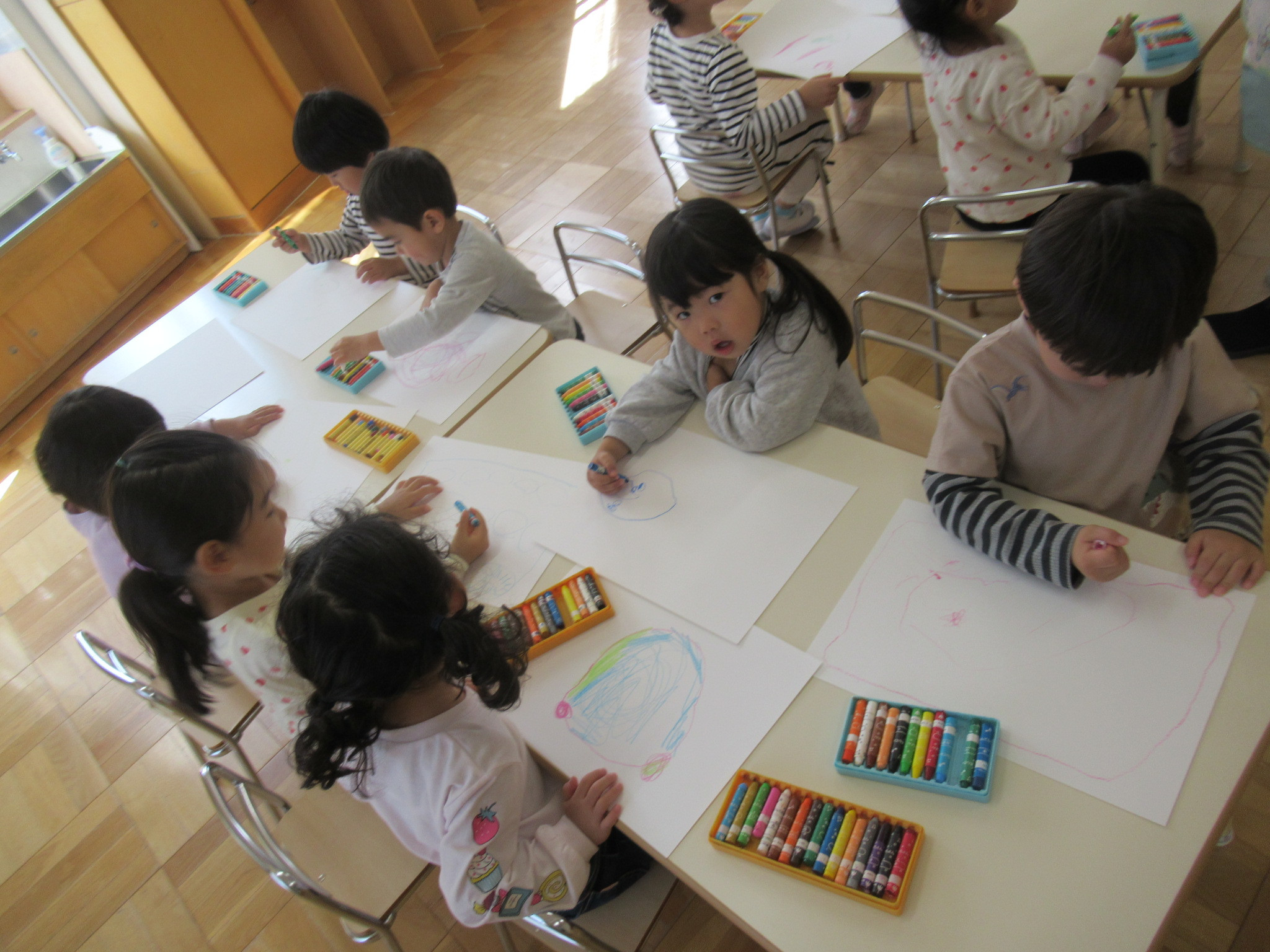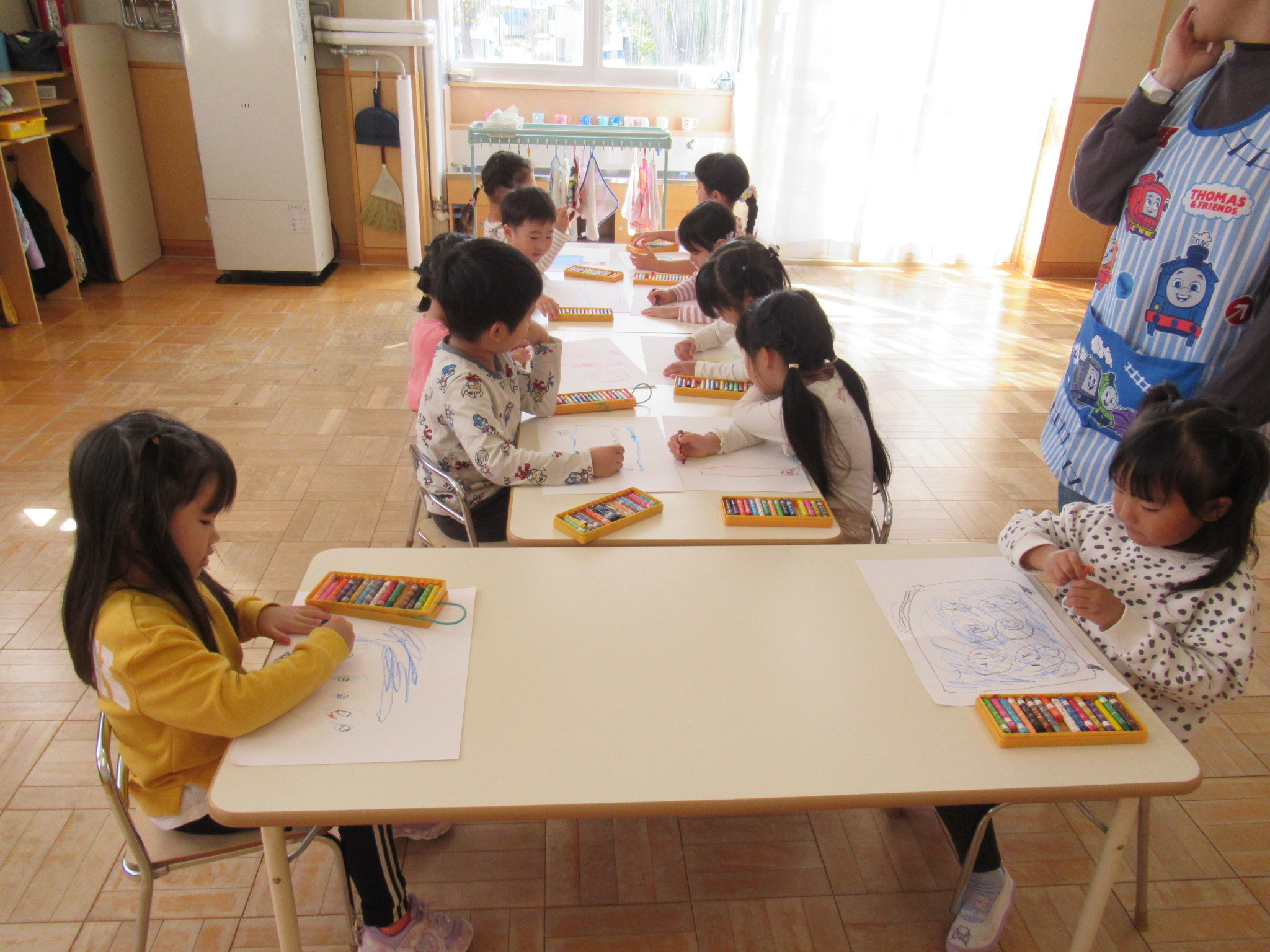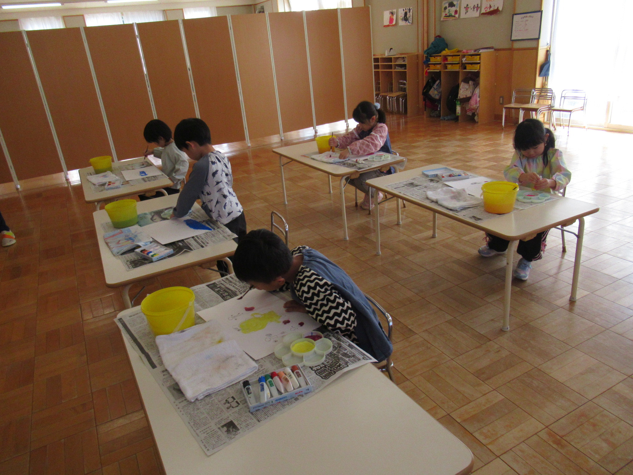 大型バス、滑り台、お弁当、時計の絵などとっても素敵な絵が完成しましたよ。