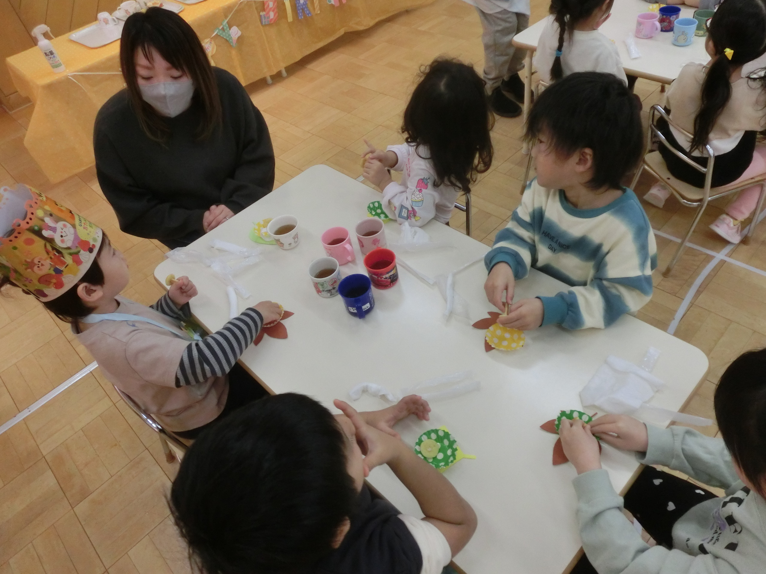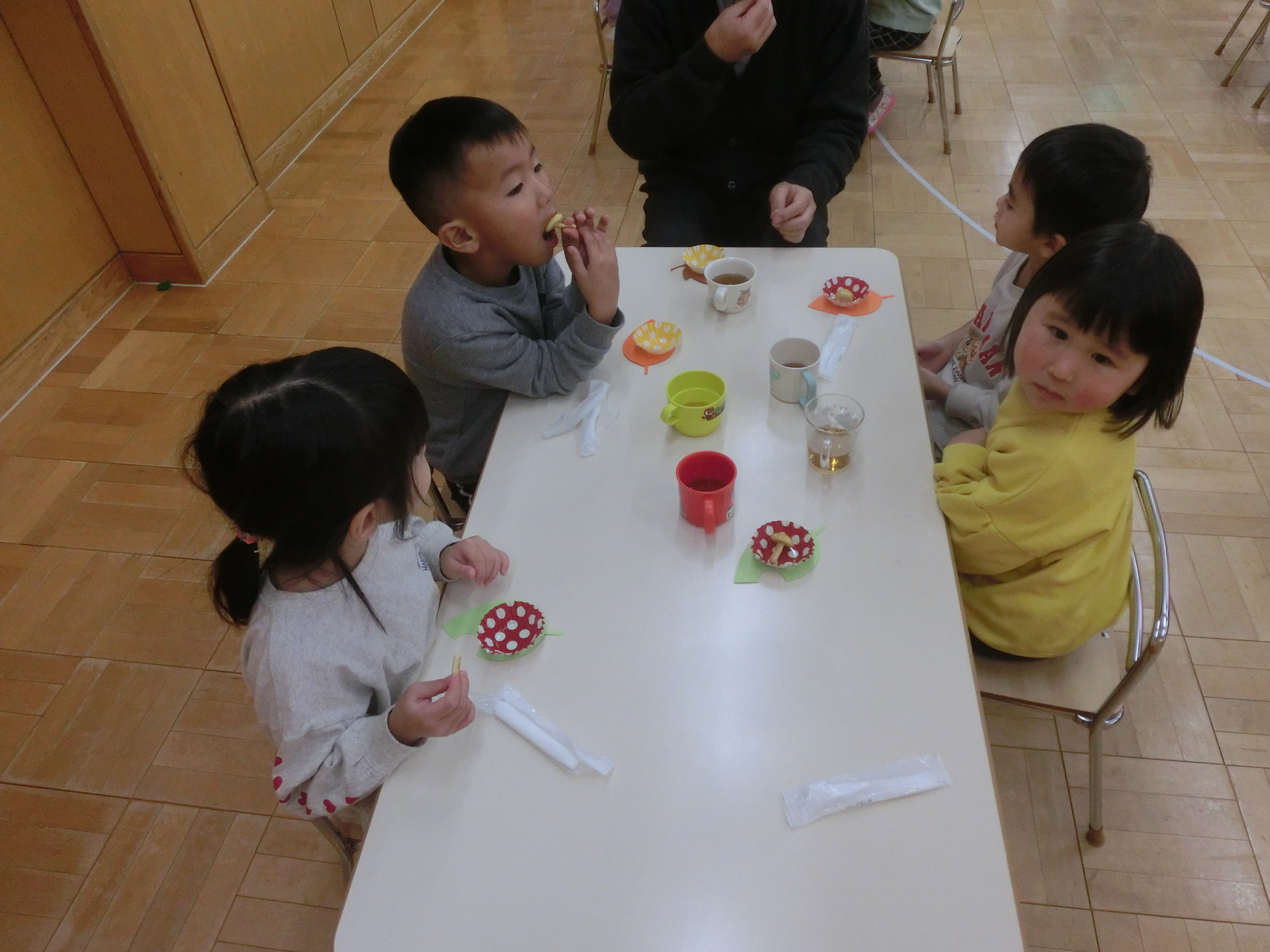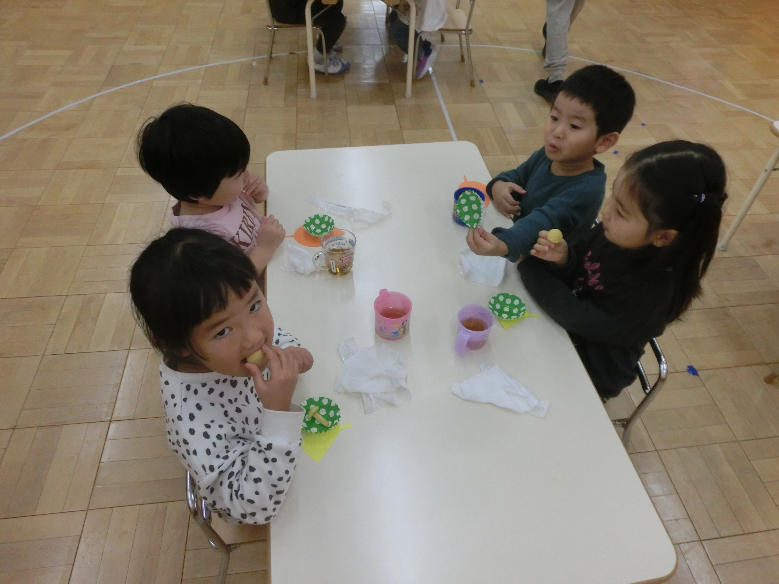 お楽しみのおやつは「きのこちゃんベビーカステラ」!「もっと食べたーい」とあっという間に食べていました。