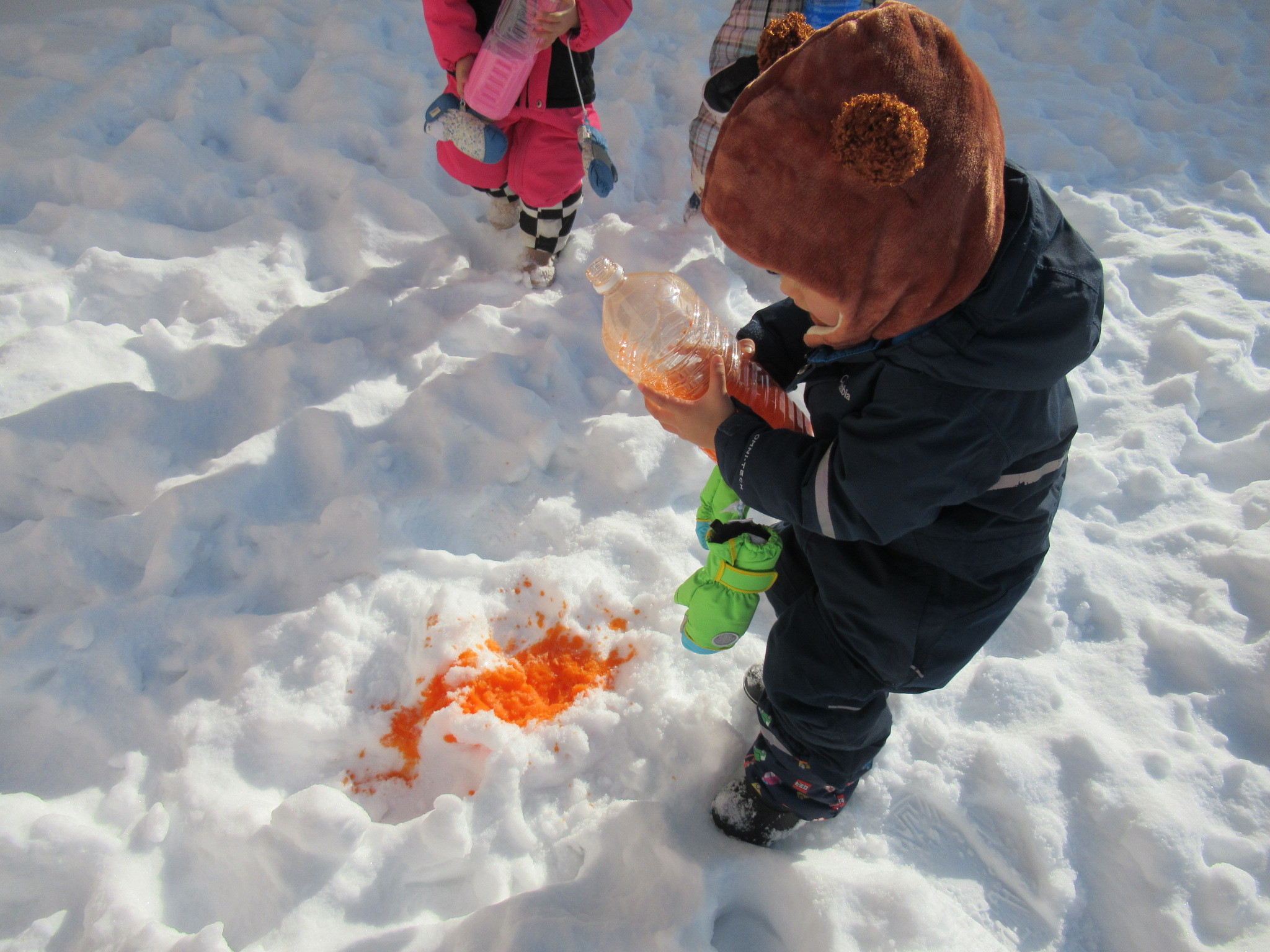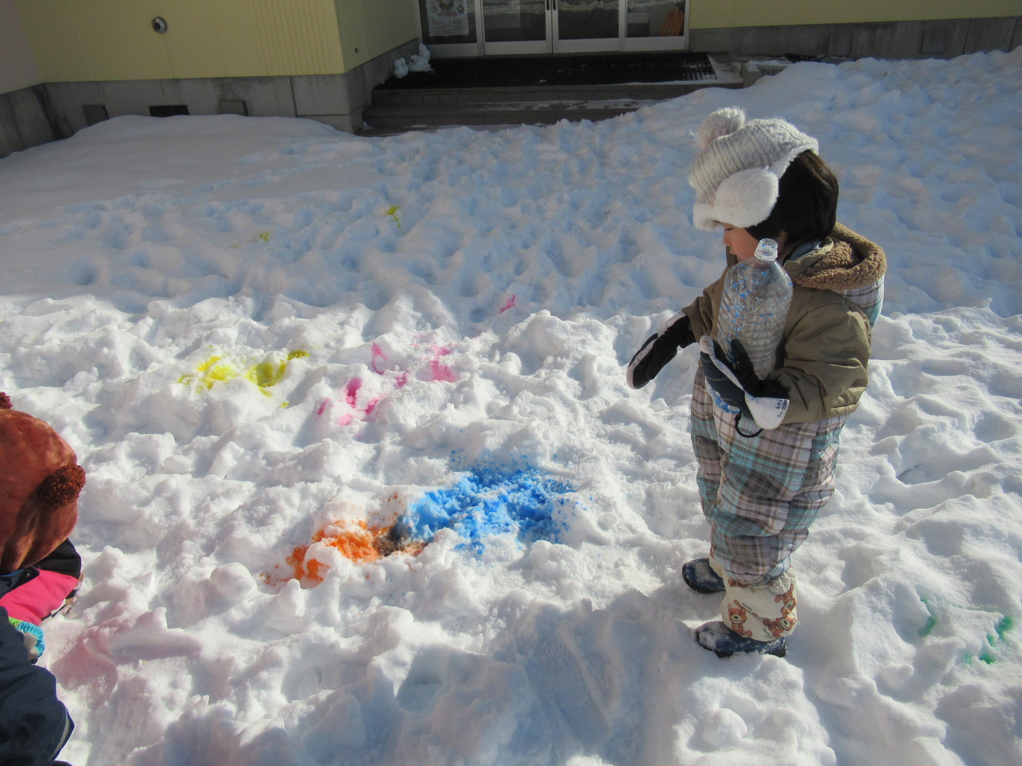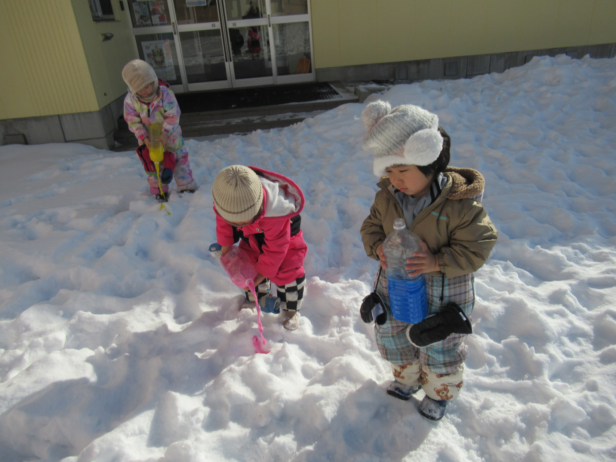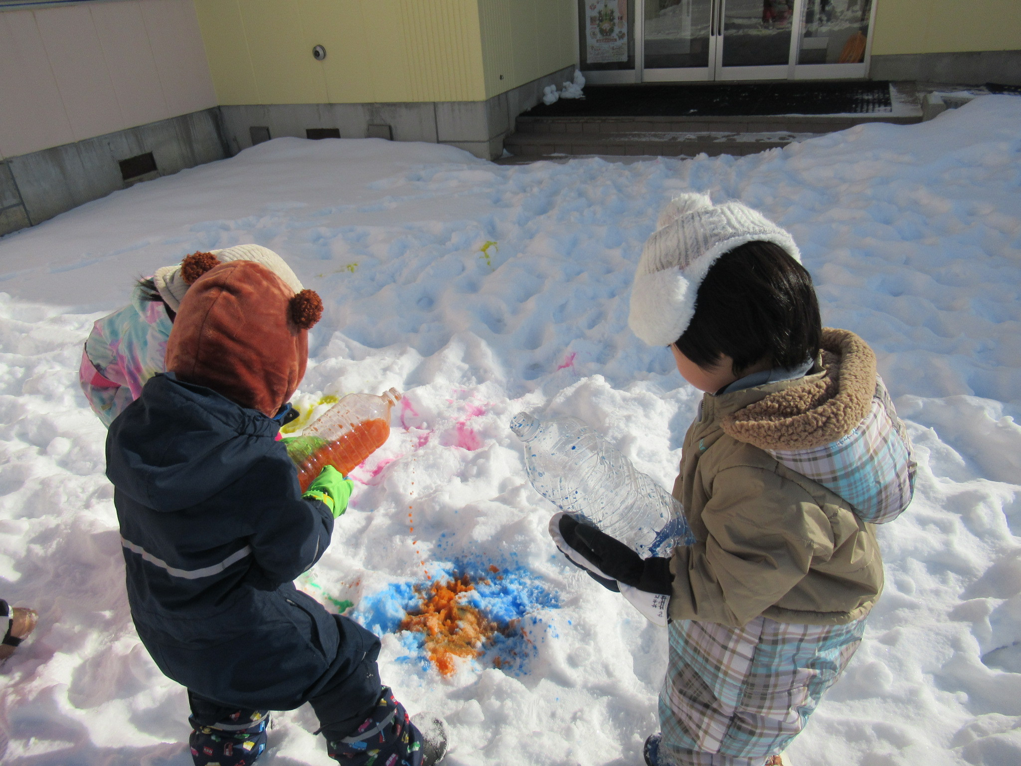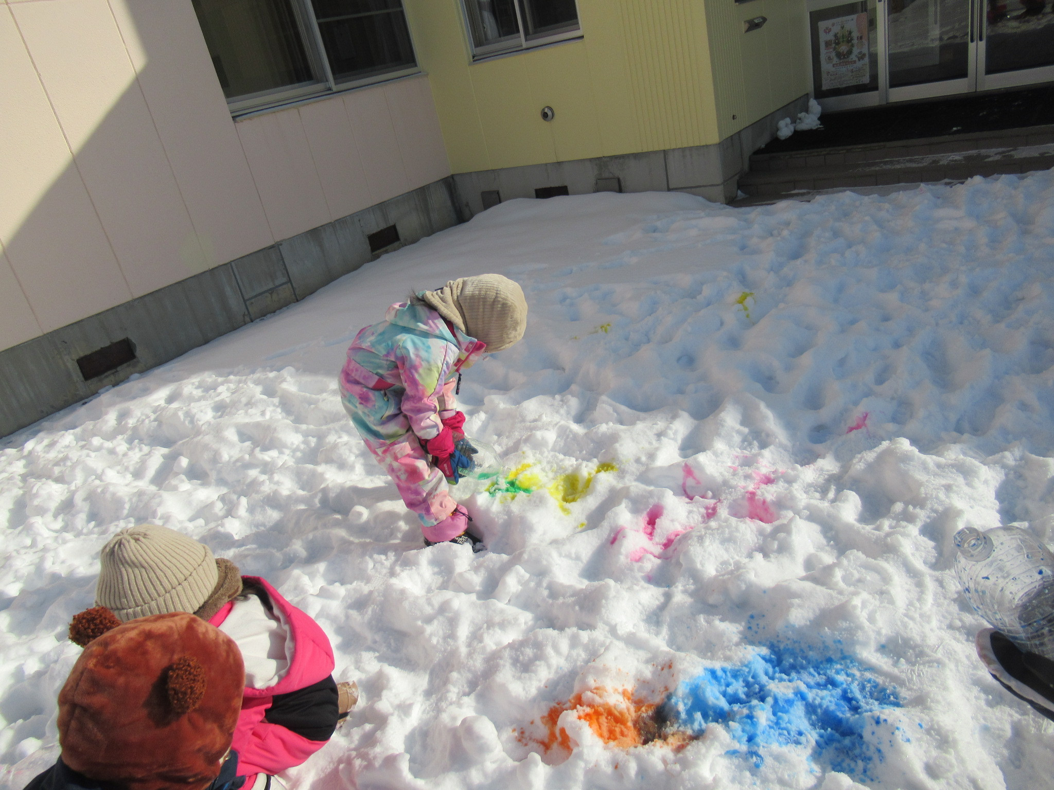 お散歩に行って色が雪になじんだところで山にしたり、宝探し?をしたりカラフルな雪遊びを楽しみました。