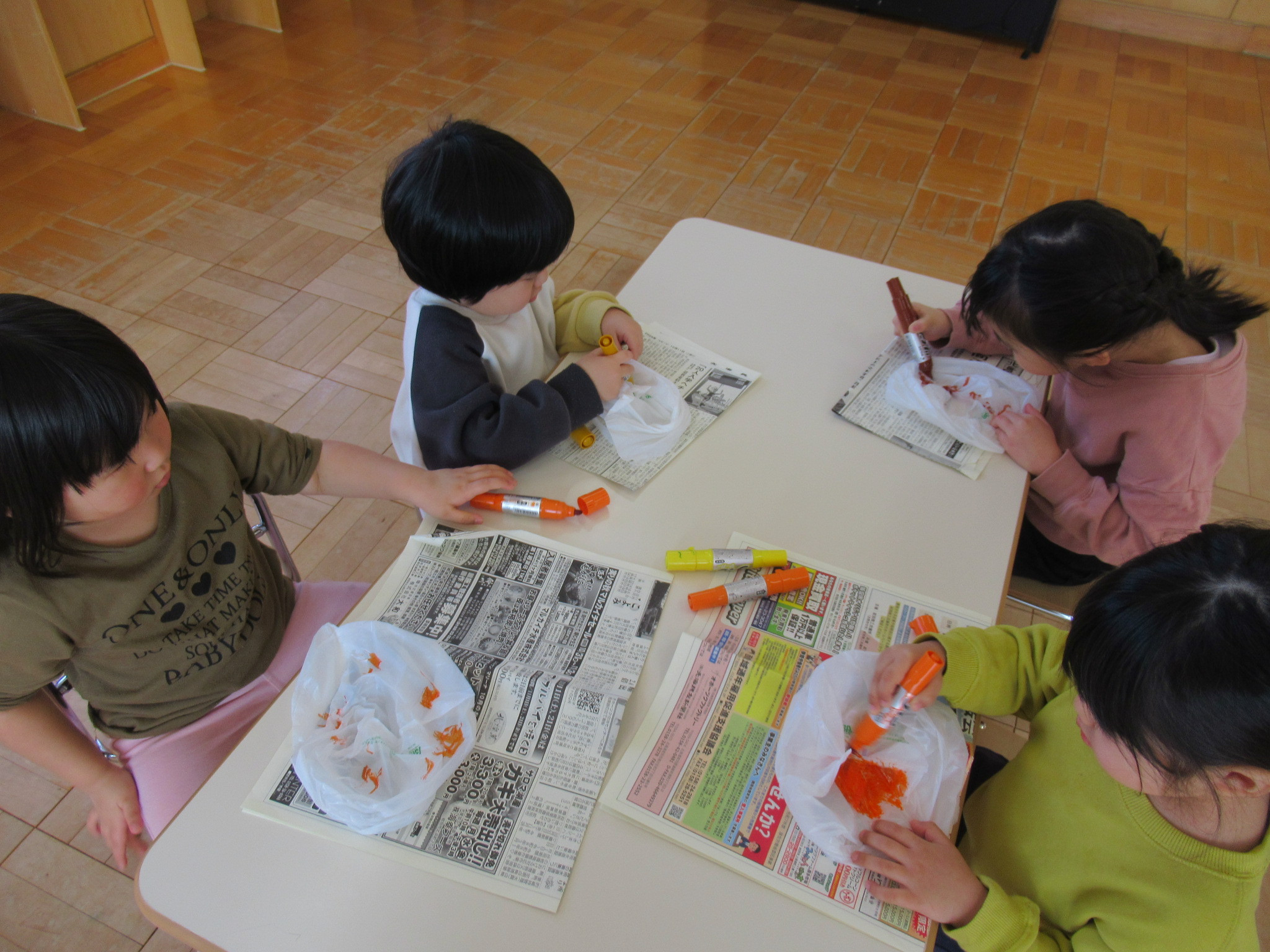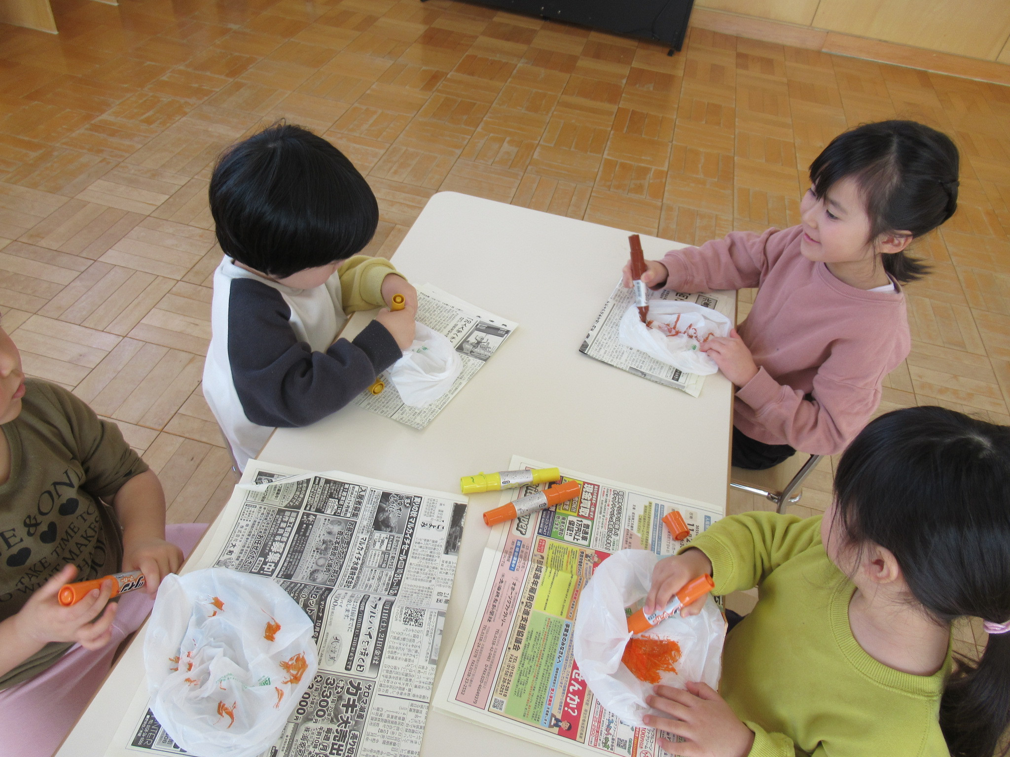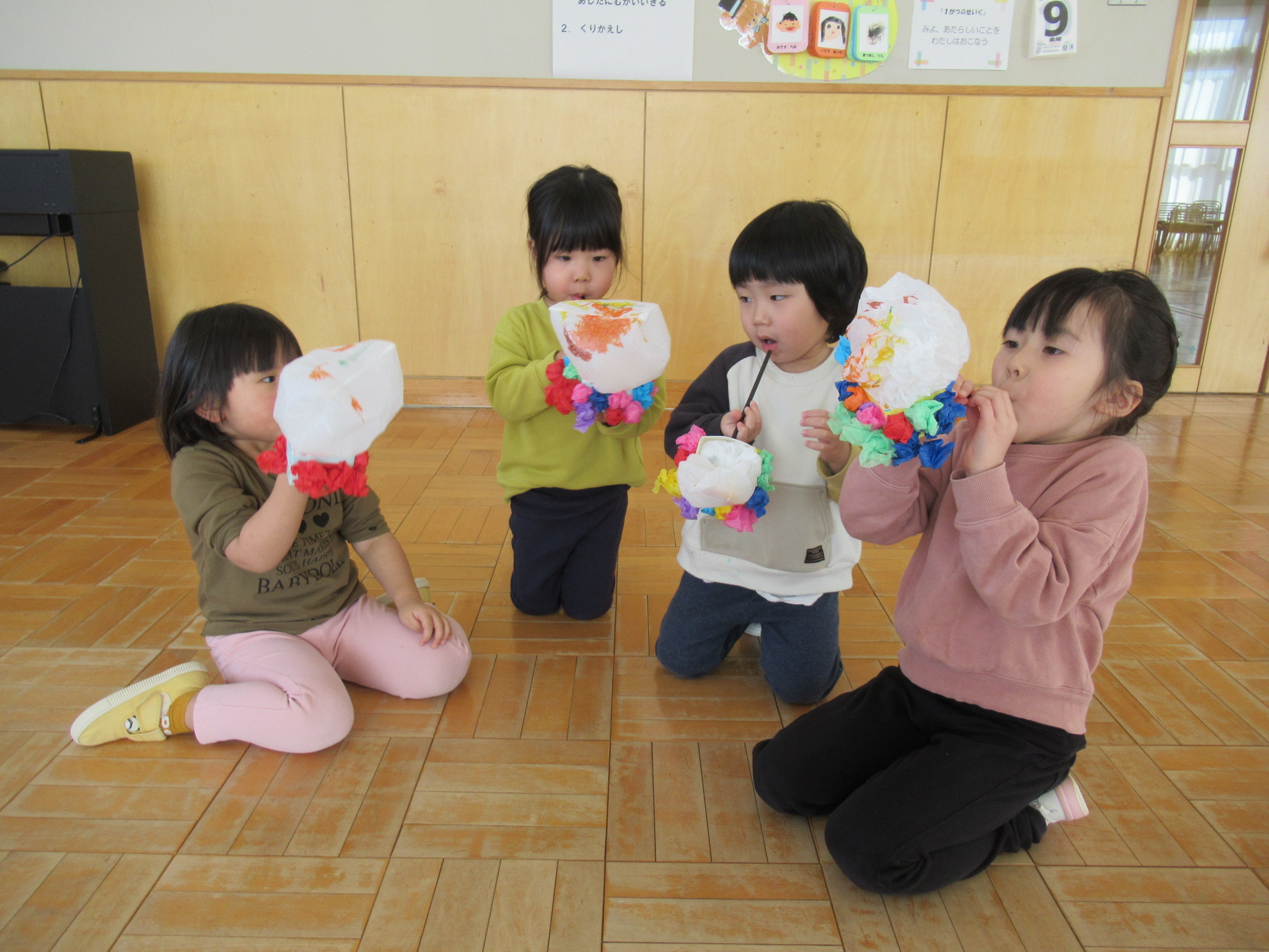 息を入れると大きく膨らむ様子に「もう一回やろう」と何度も膨らませて「これきなこつけて食べよ」「醤油つけよう」と盛り上がっていました。