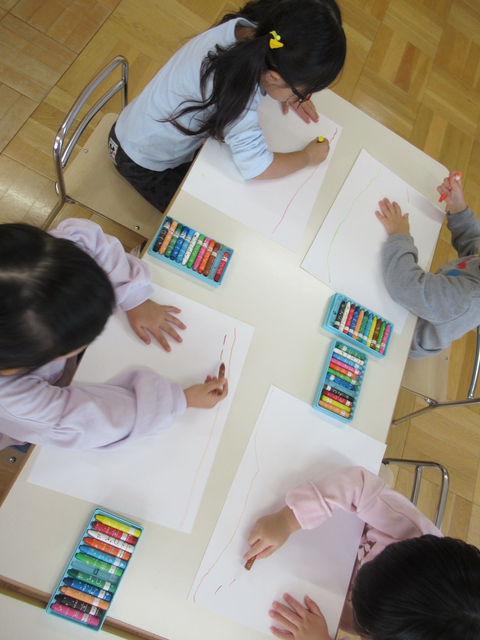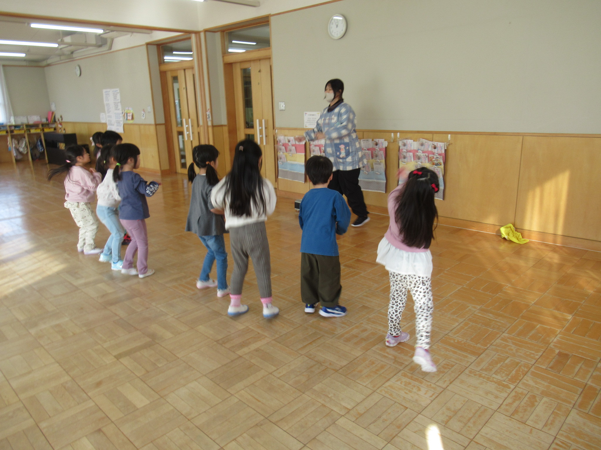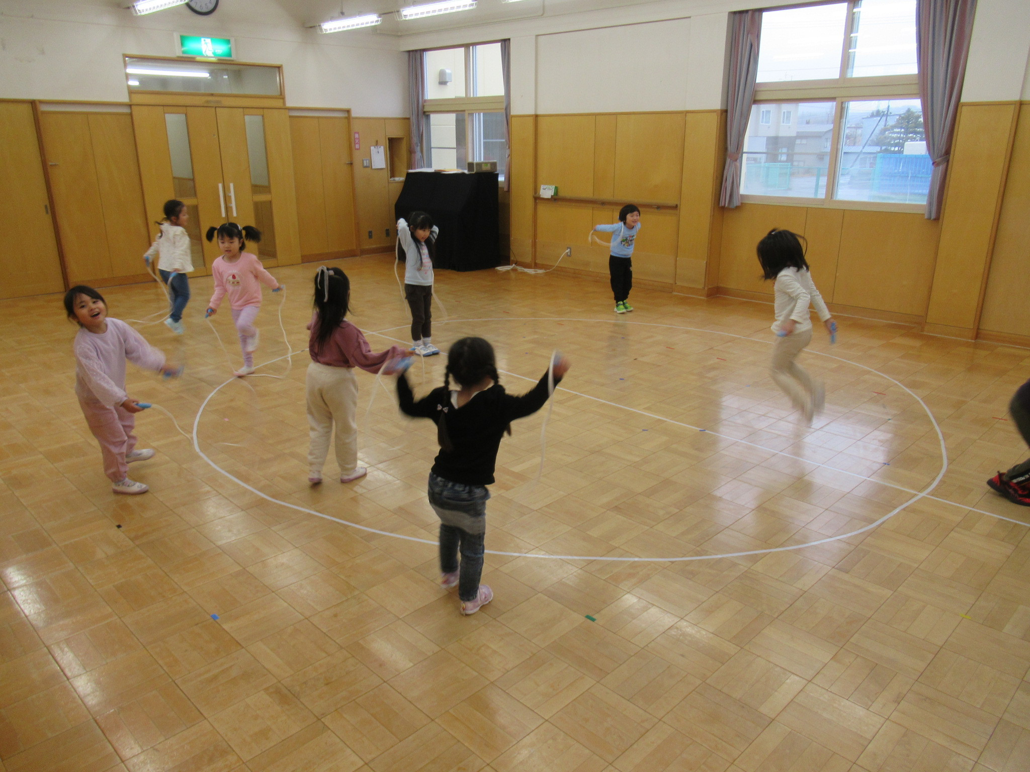 元気いっぱいに発表会の練習をしています。練習の後は線遊びやなわとびをして遊びました。