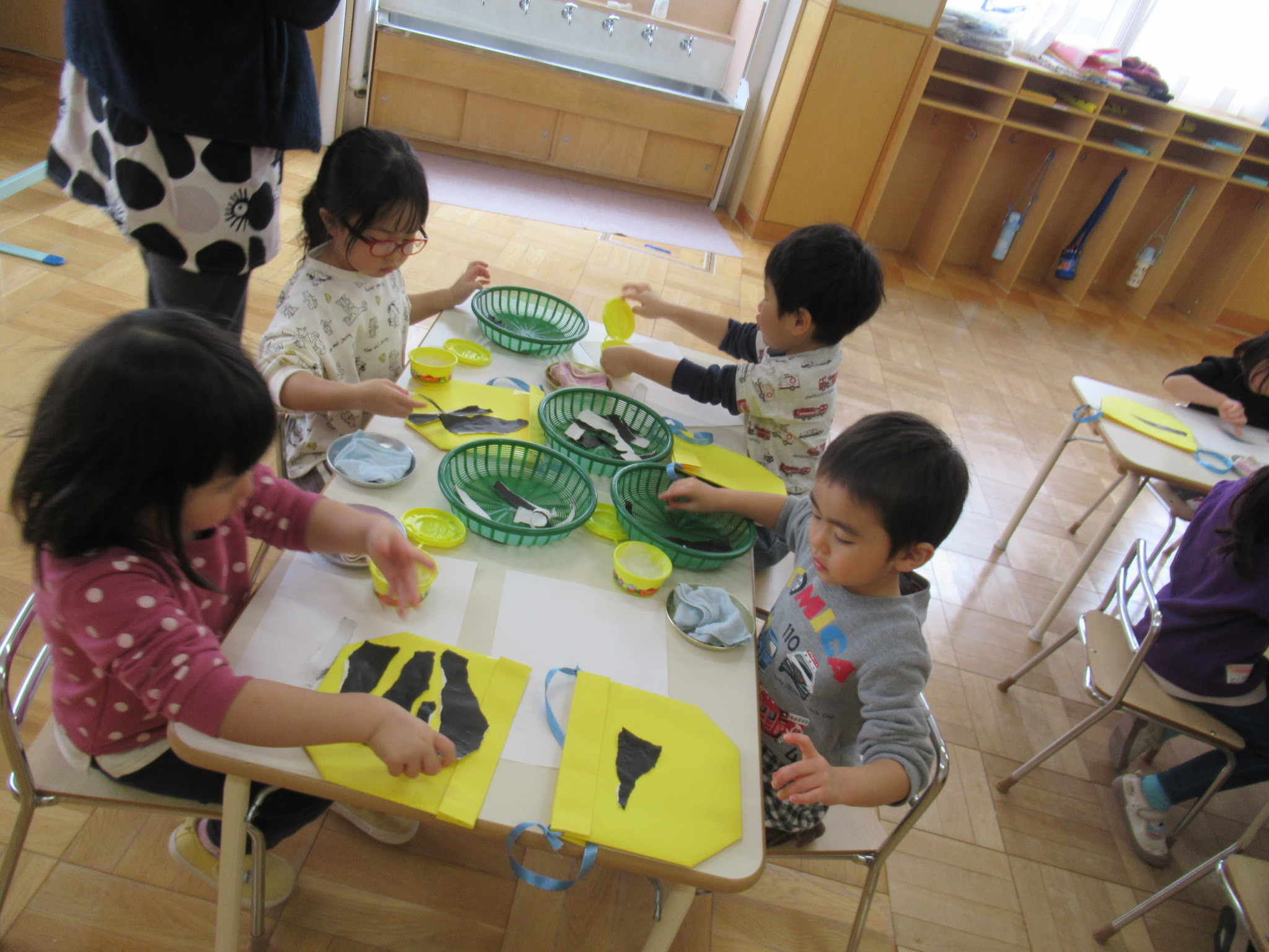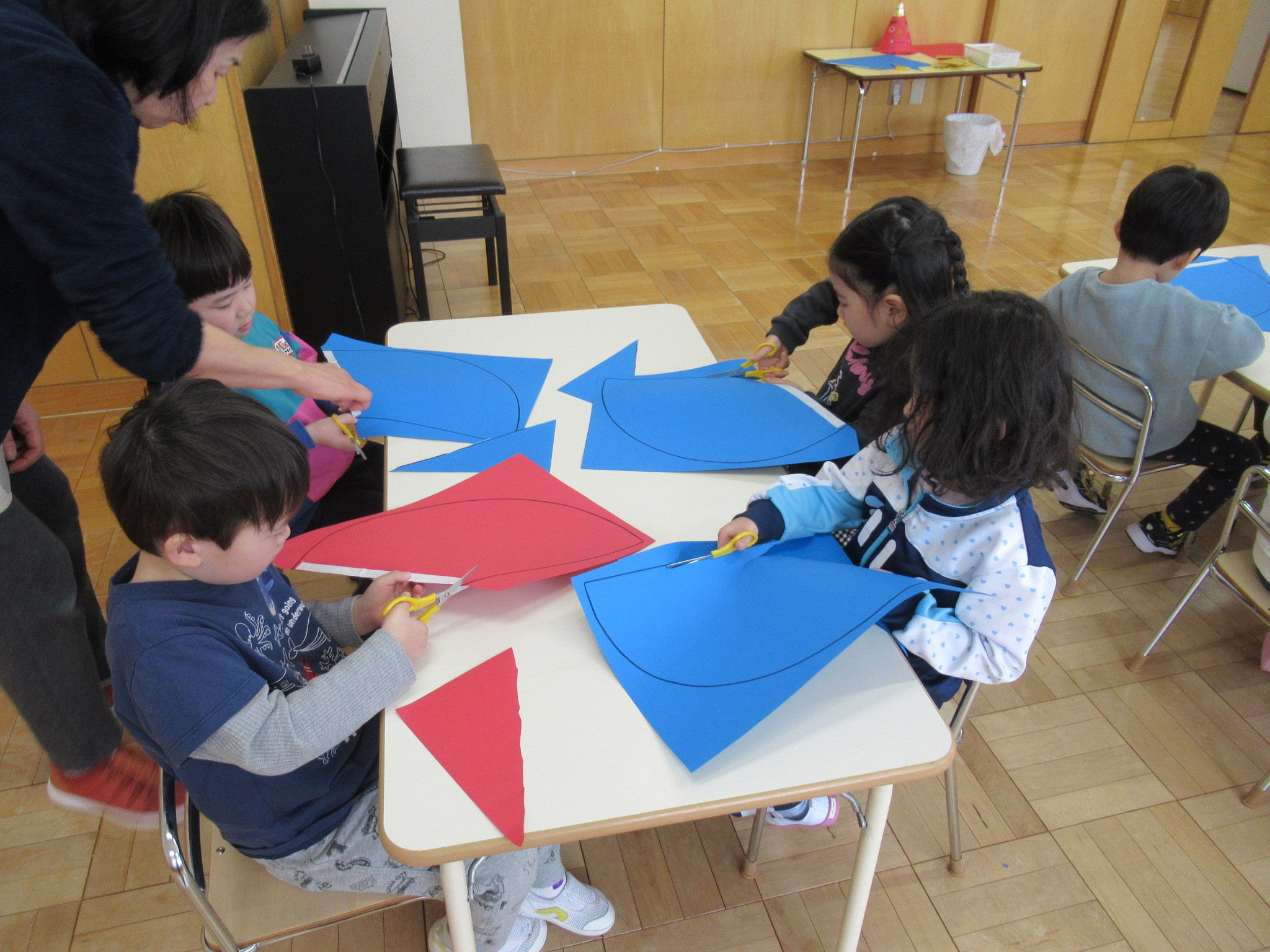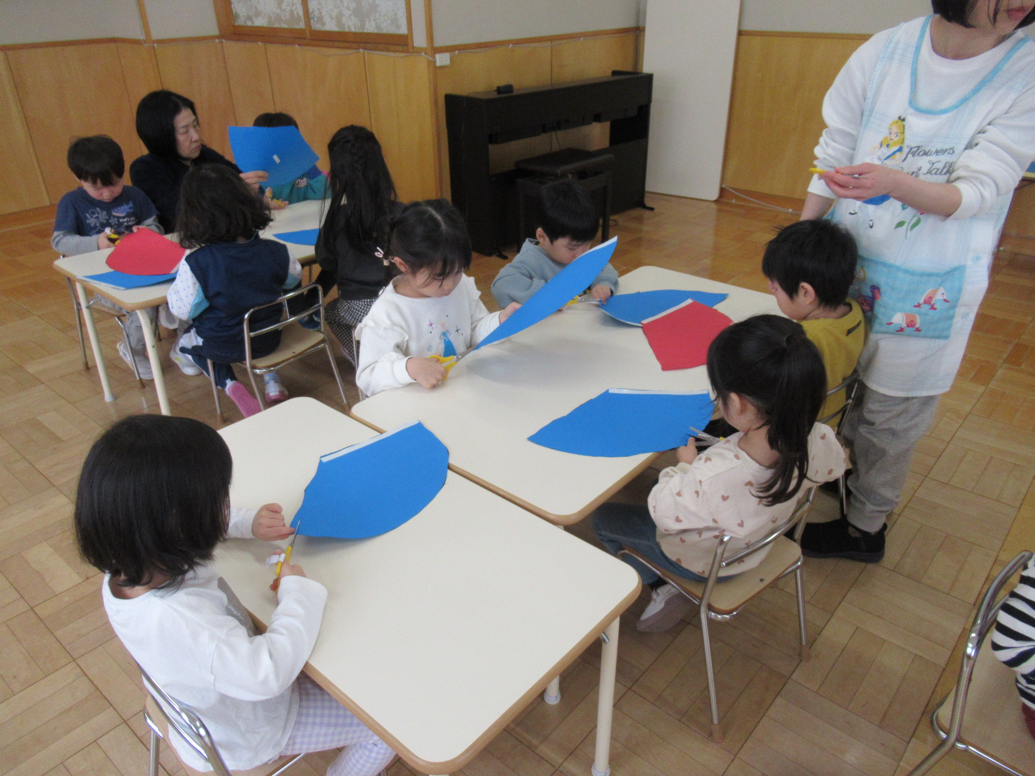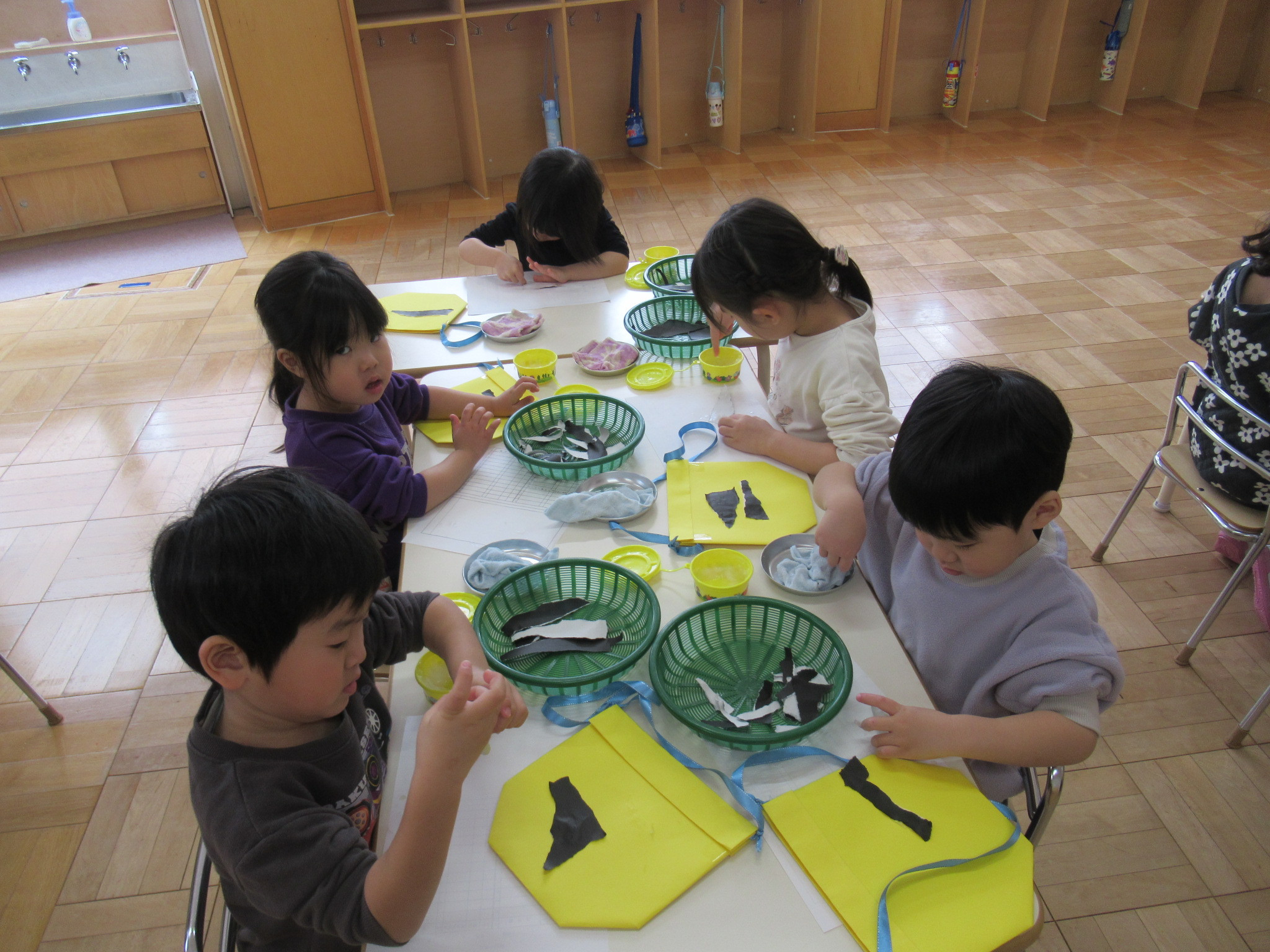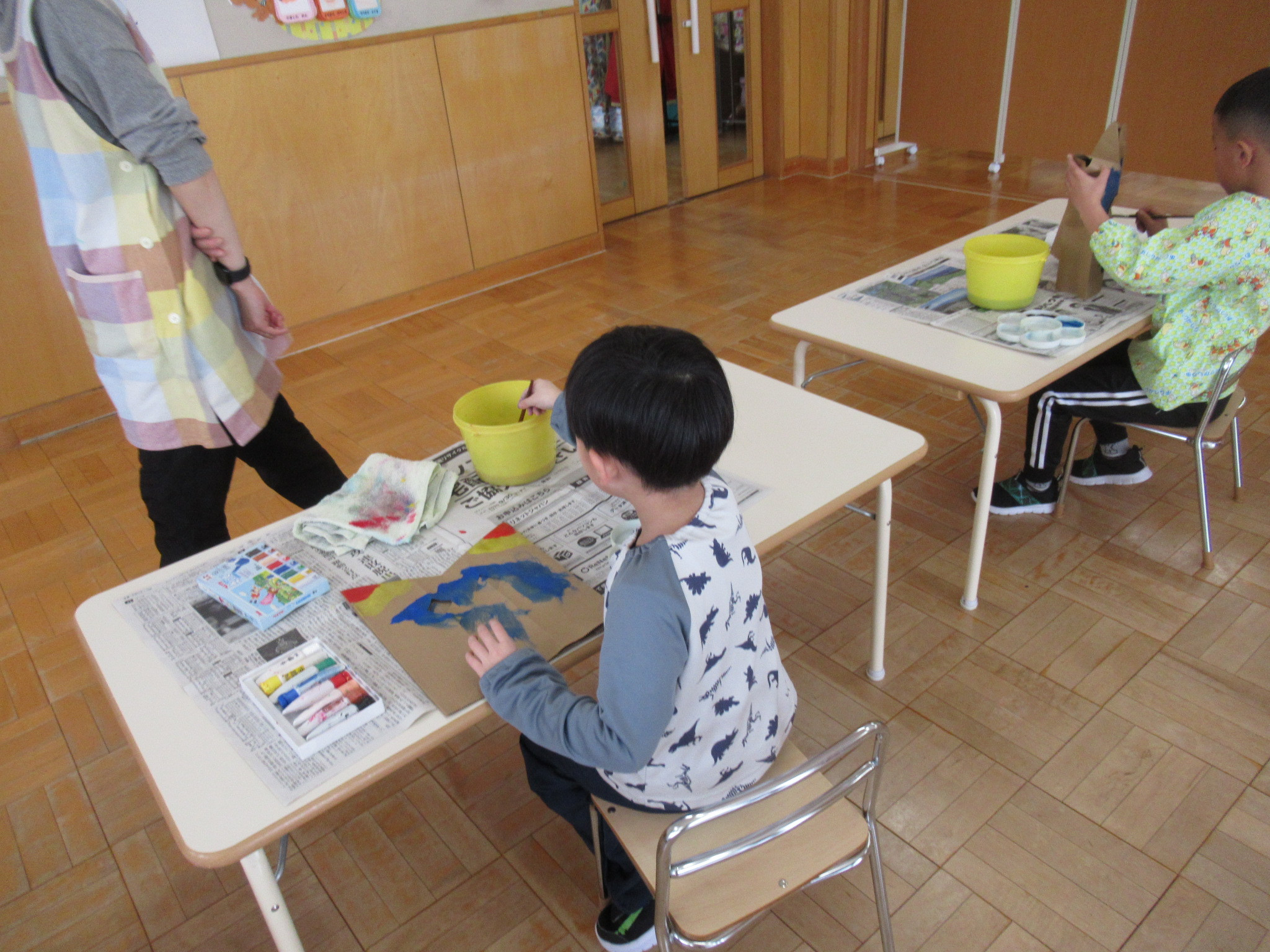 らっこ・ぺんぎん組はのりを使い、いるか組はハサミやのり、くじら組は絵の具などを使って製作しました。
