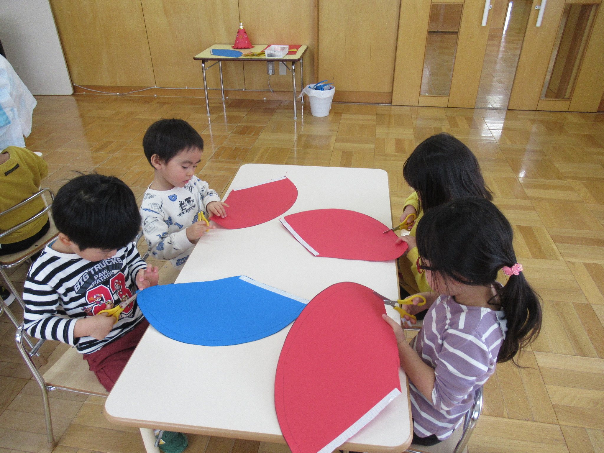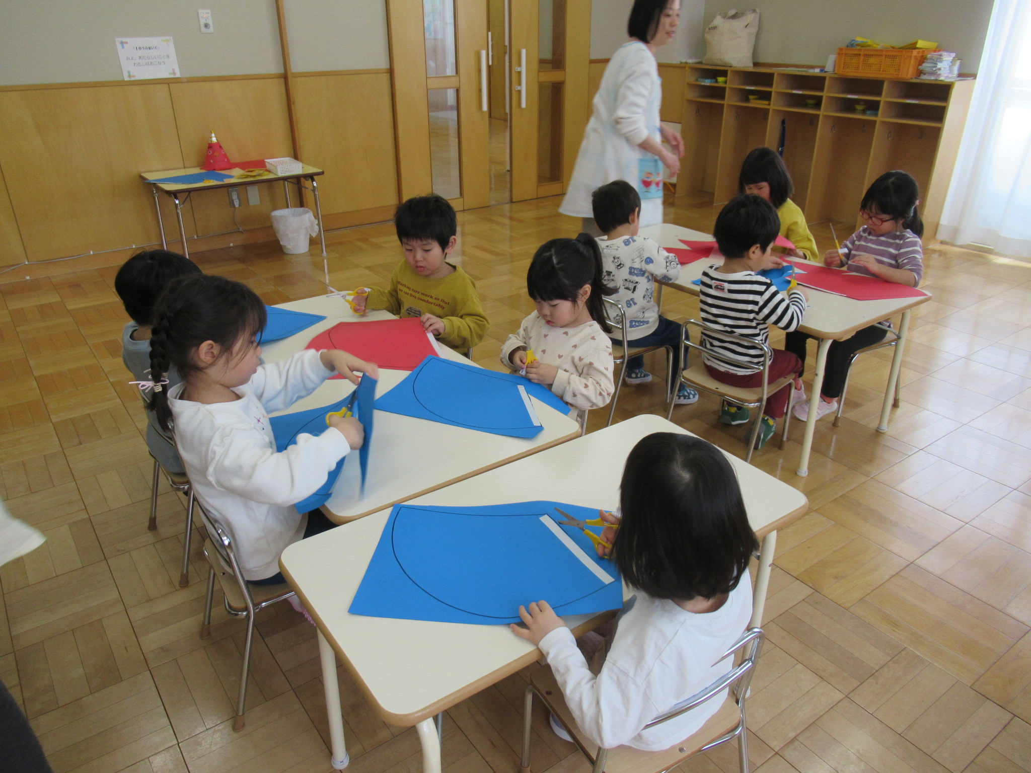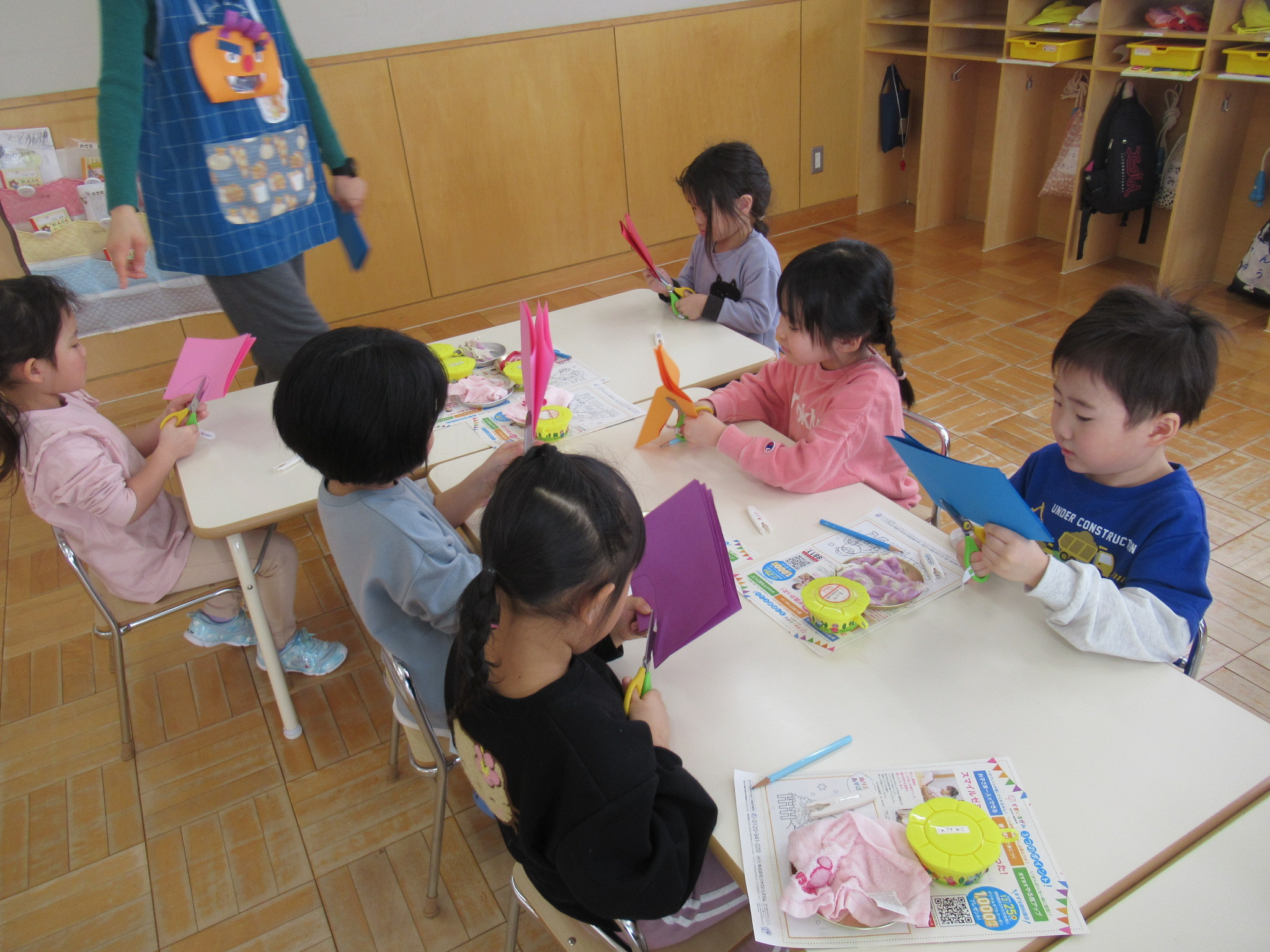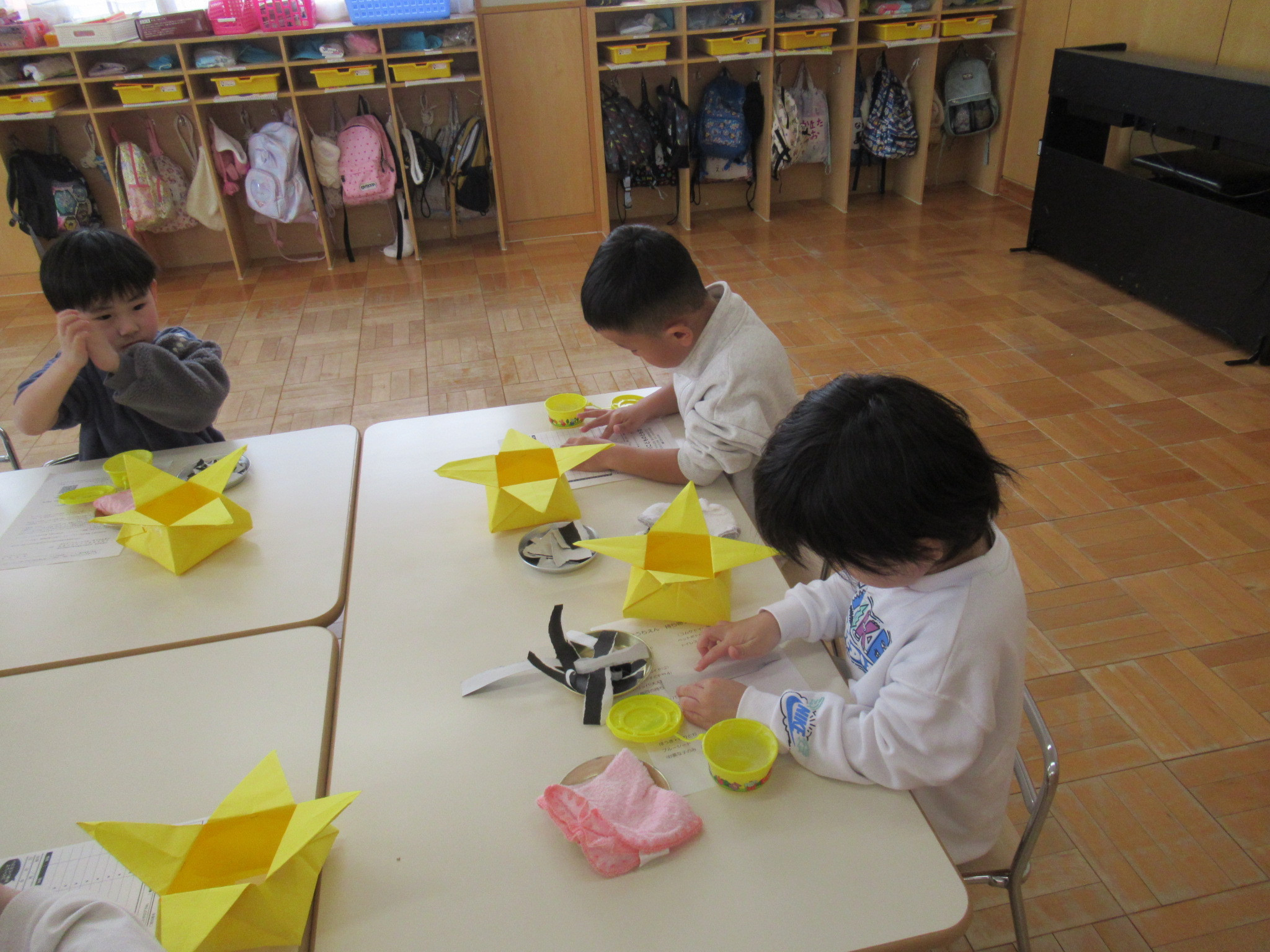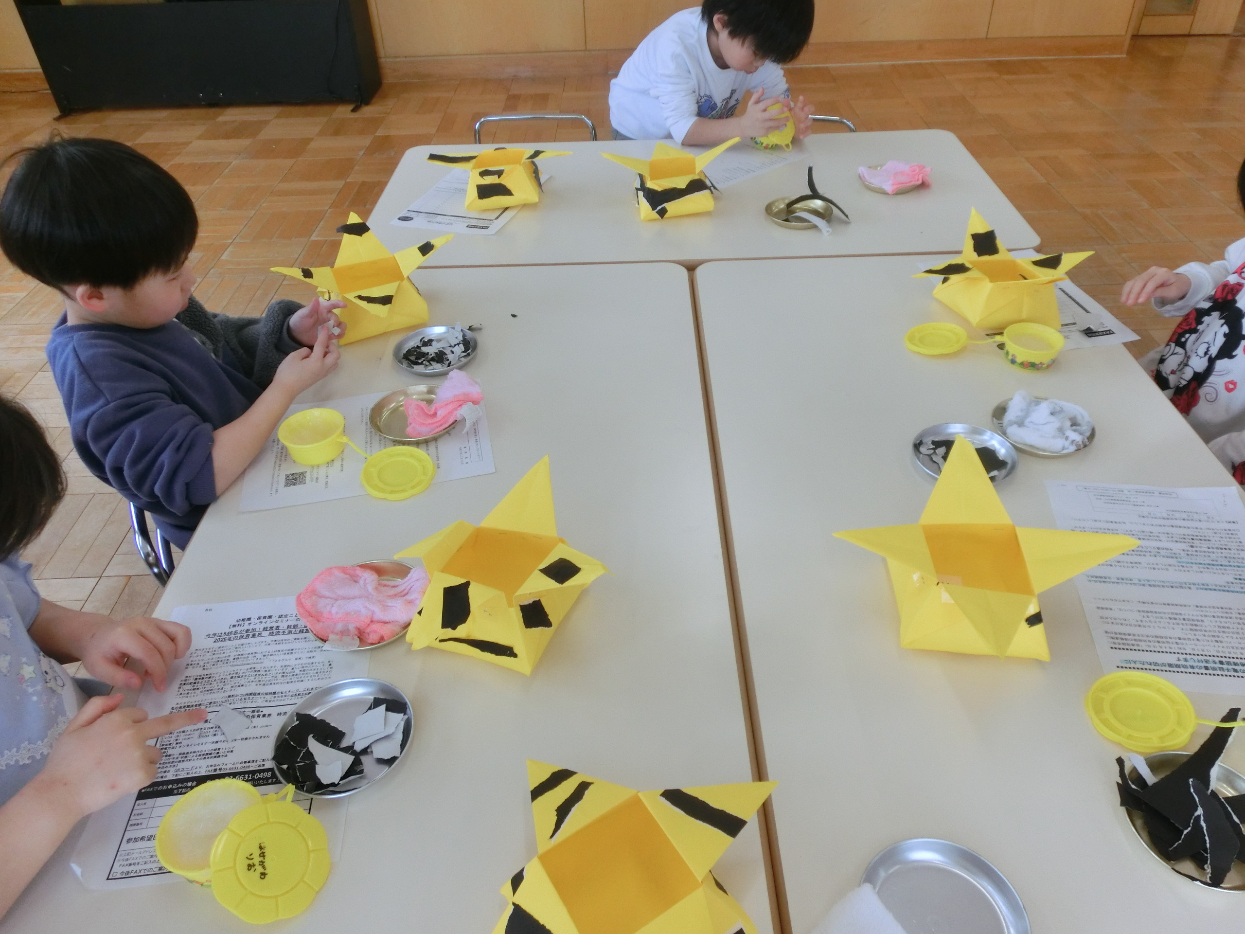 らっこ・ぺんぎん組はのりを使い、いるか組はハサミやのり、くじら組は絵の具などを使って製作しました。