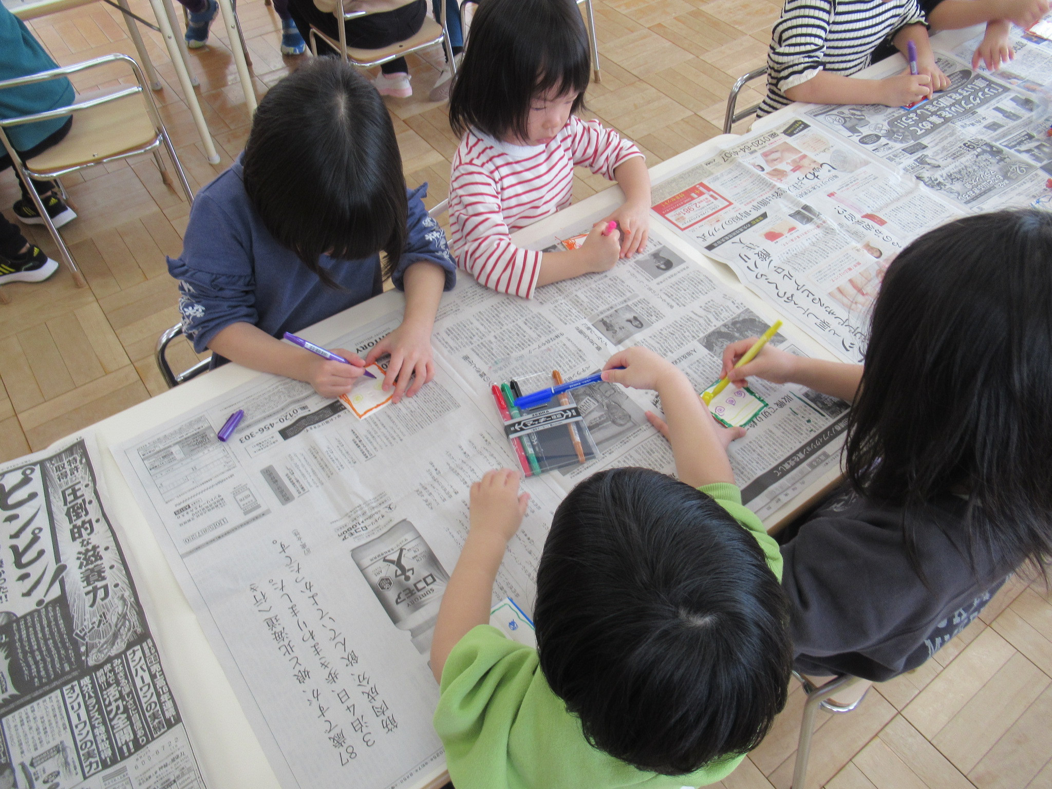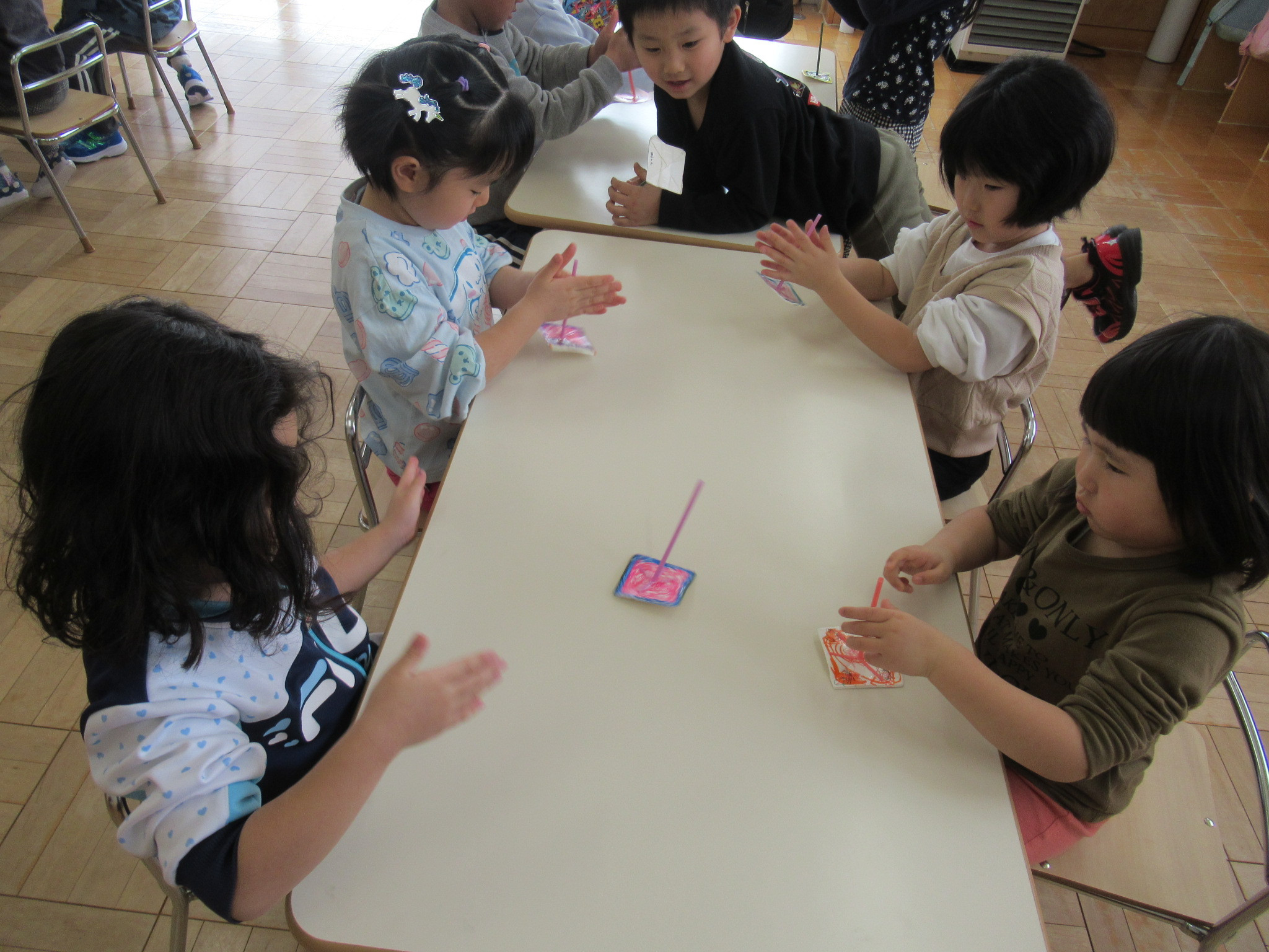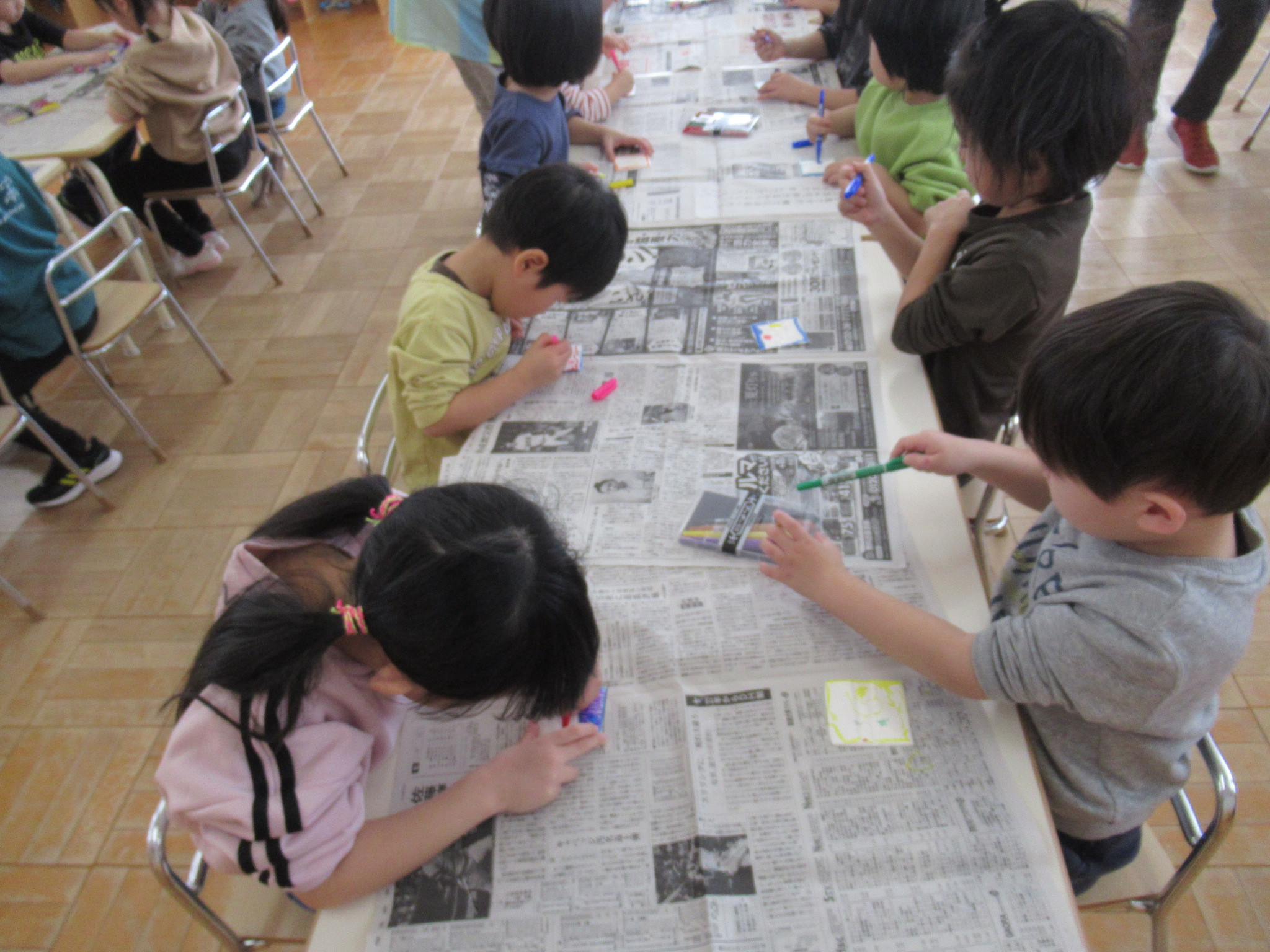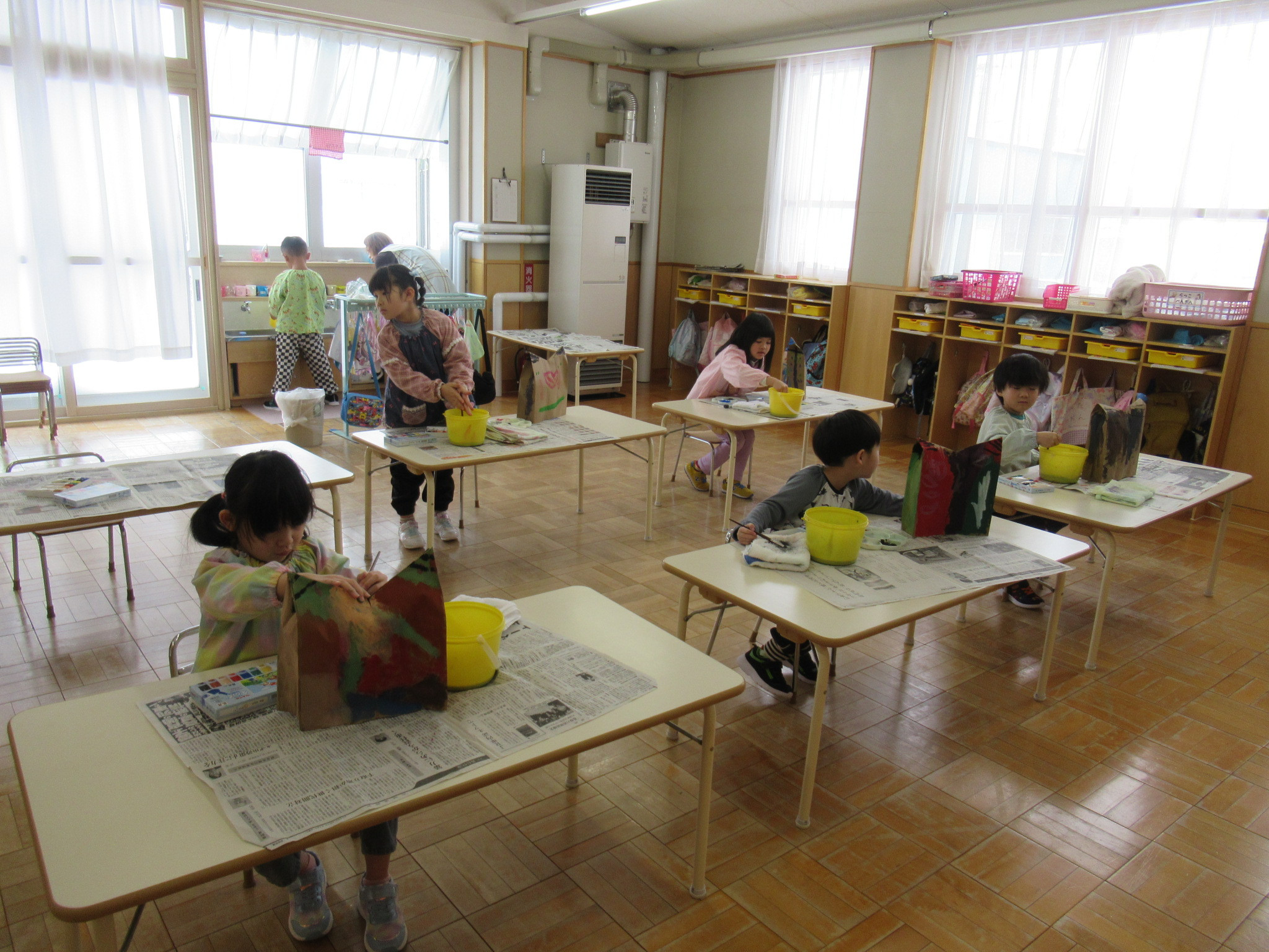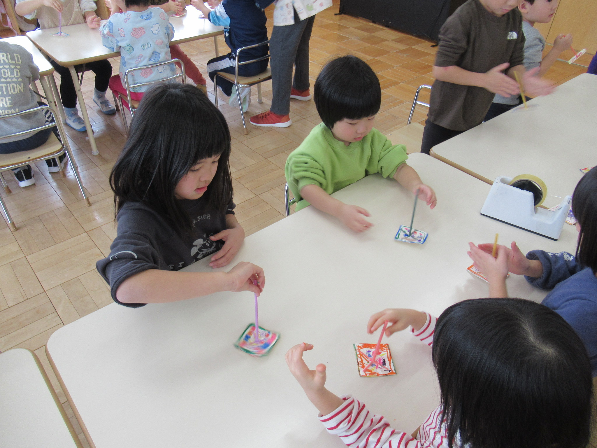 らっこ・ぺんぎん組はのりを使い、いるか組はハサミやのり、くじら組は絵の具などを使って製作しました。