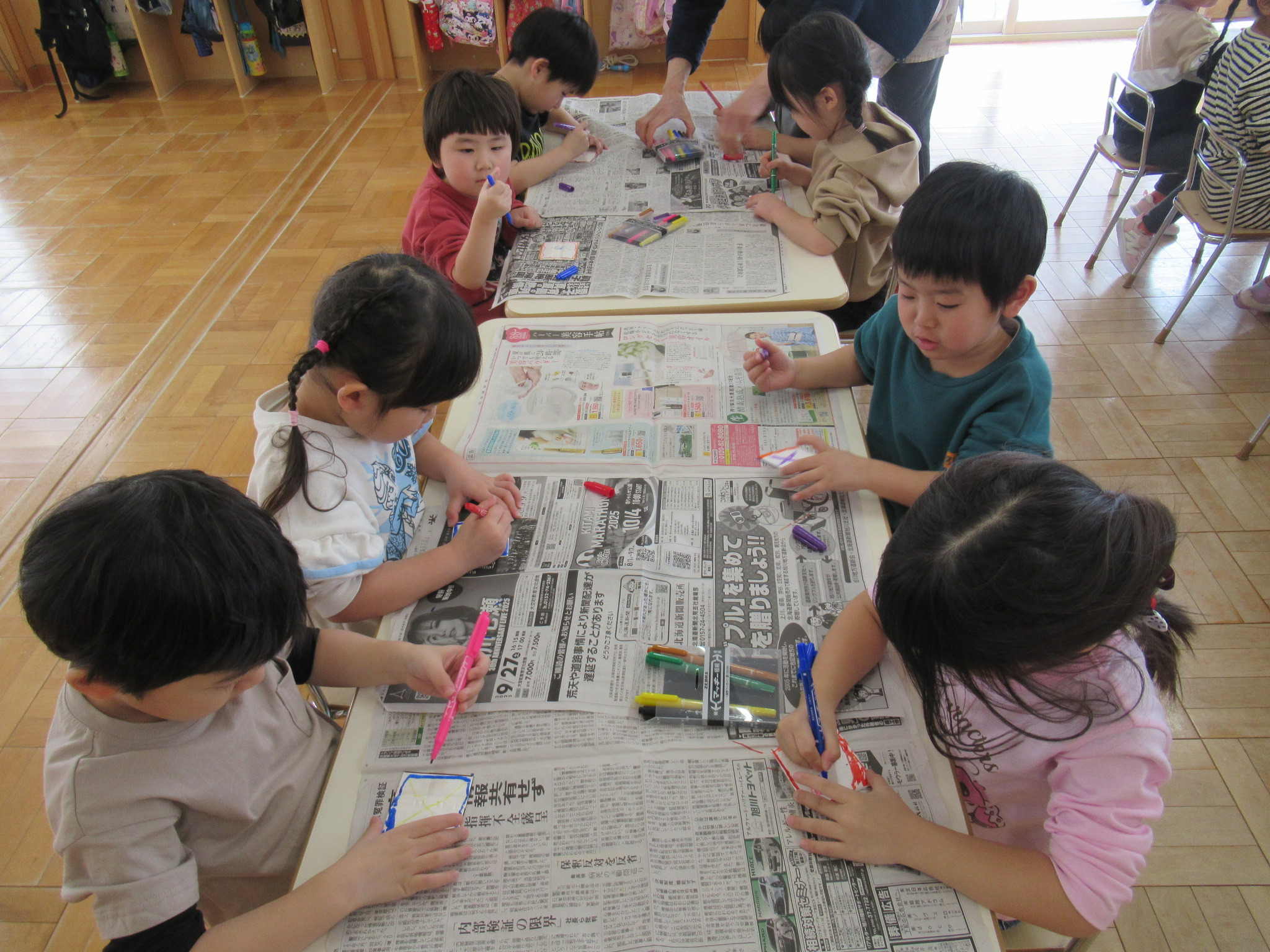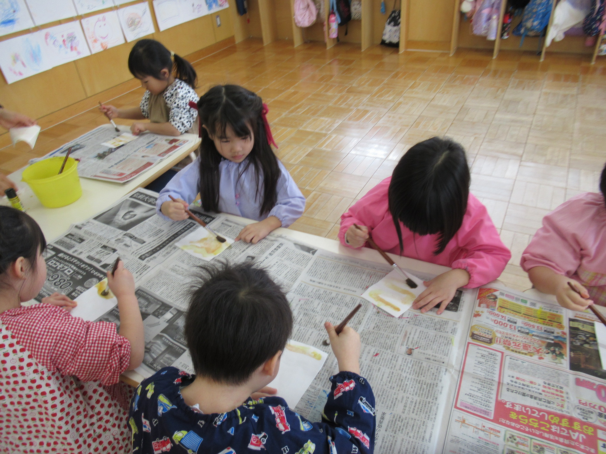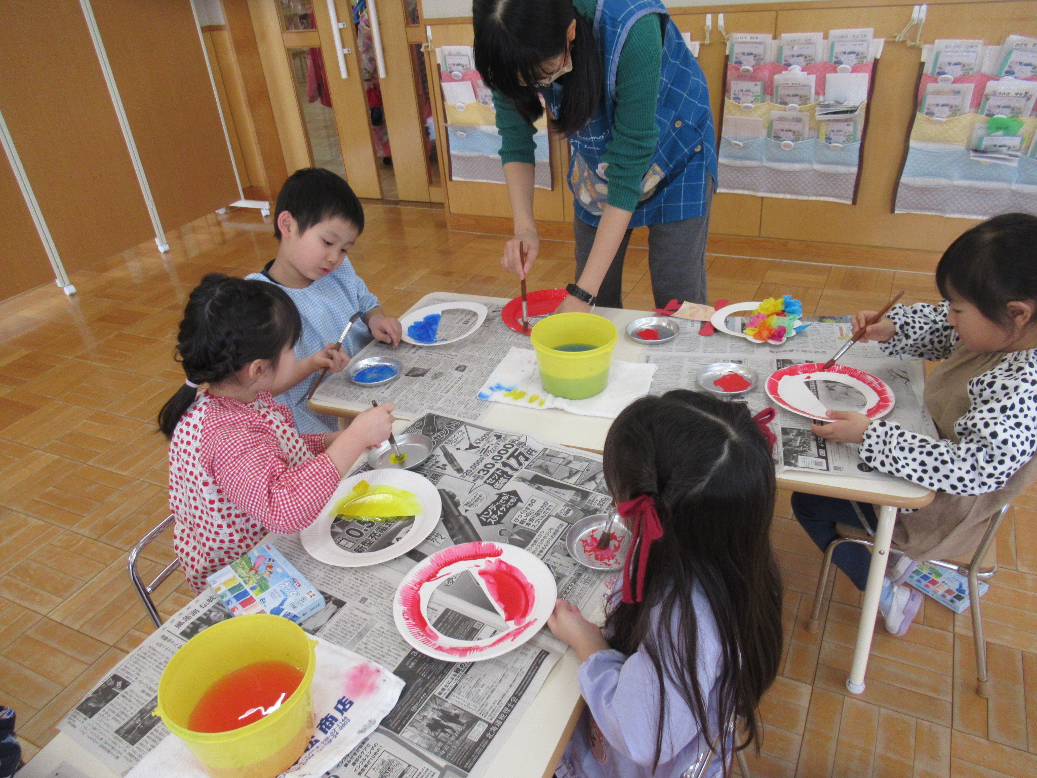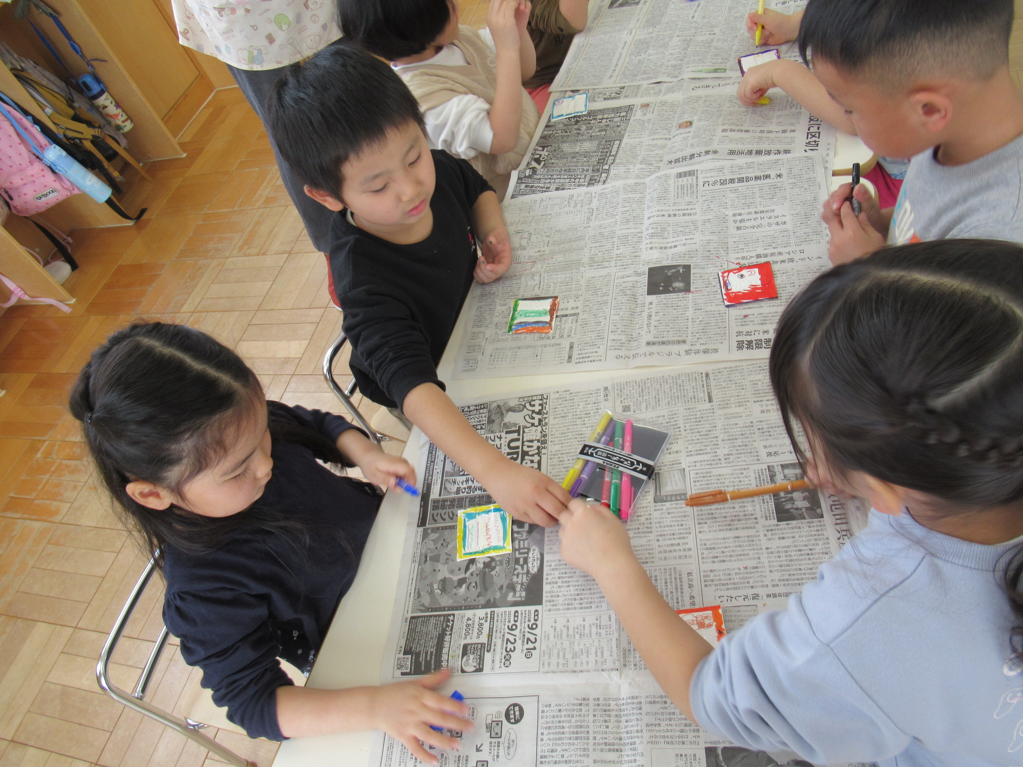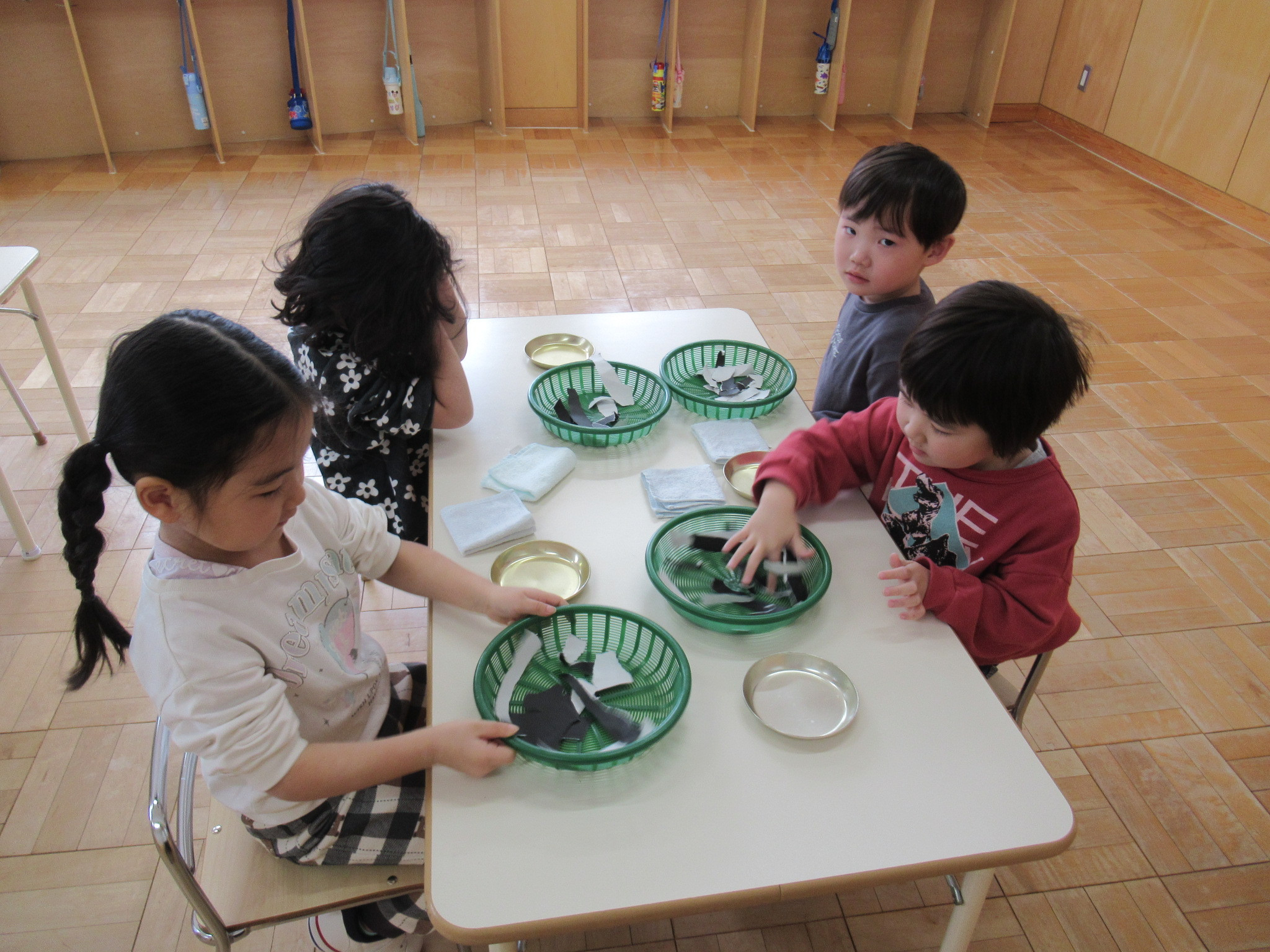 らっこ・ぺんぎん組はのりを使い、いるか組はハサミやのり、くじら組は絵の具などを使って製作しました。