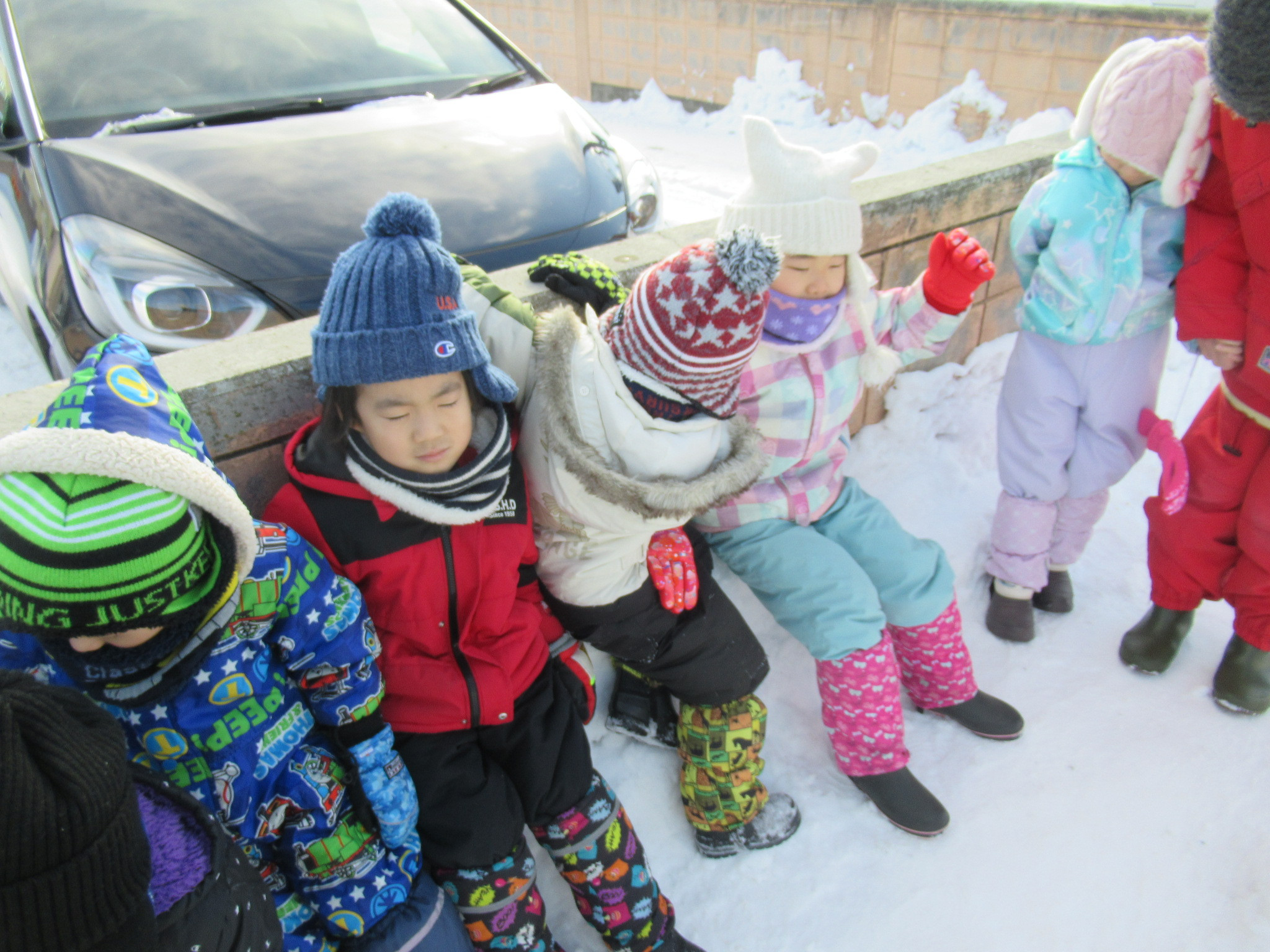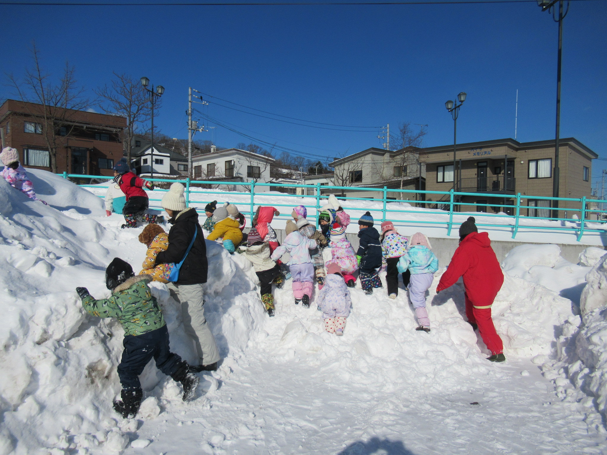 雪の山を登ったり探検しながら歩きました。雪でいっぱいになりましたが笑顔もいっぱいでした。